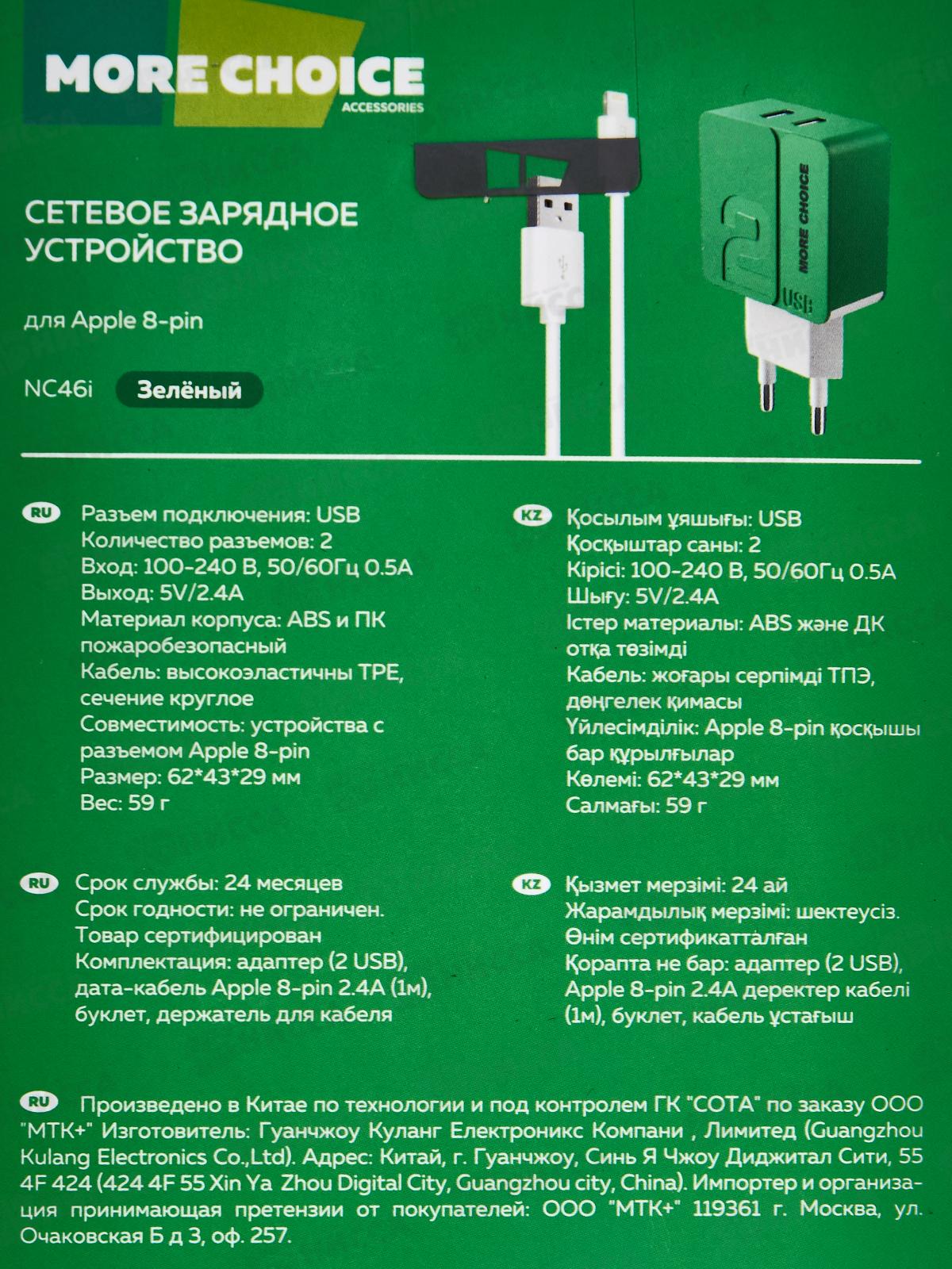 Зарядное устройство сетевое 2USB 2.4A для Lightning 8-pin More choice NC46i 1м, зеленый