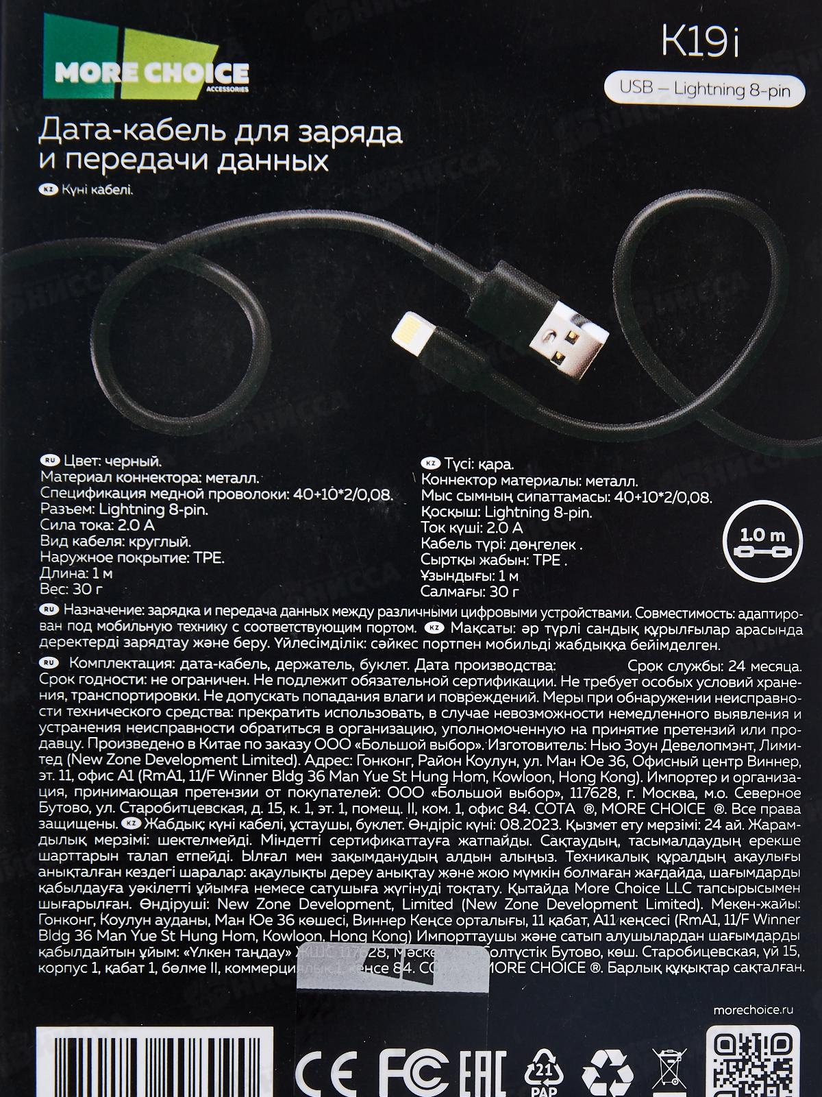 Дата-кабель More choice K19i - оптимальное сочетание высокого качества и доступной цены. Он обладает высокой производительностью и практичностью, что делает его идеальным выбором для всех, кто ищет надежный кабель для своего телефона. Оптимальная длина шнура в 1 метр позволит без труда подключить и удобно расположить все устройства в рабочем пространстве. Применять его можно с любой портативной техникой, снабженной интерфейсом подключения Lightning 8-pin. Кабель поддерживает функции зарядки и передачи данных между устройствами. Длина кабеля – 1 м, вес – 30 г.