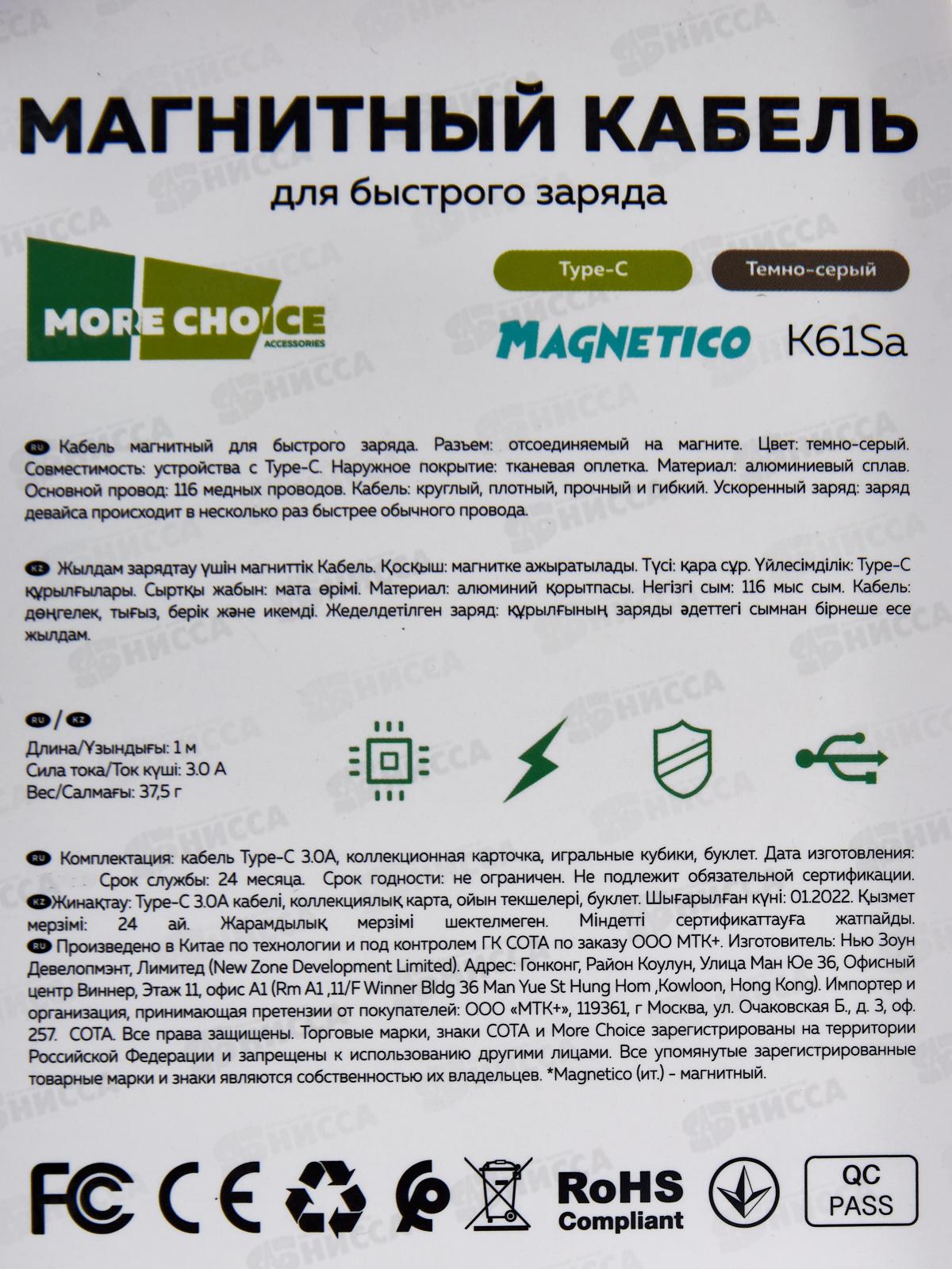Дата-кабель More Smart USB 3.0A для Type-C Magnetic choice K61Sa нейлон 1м, темно-серый *34