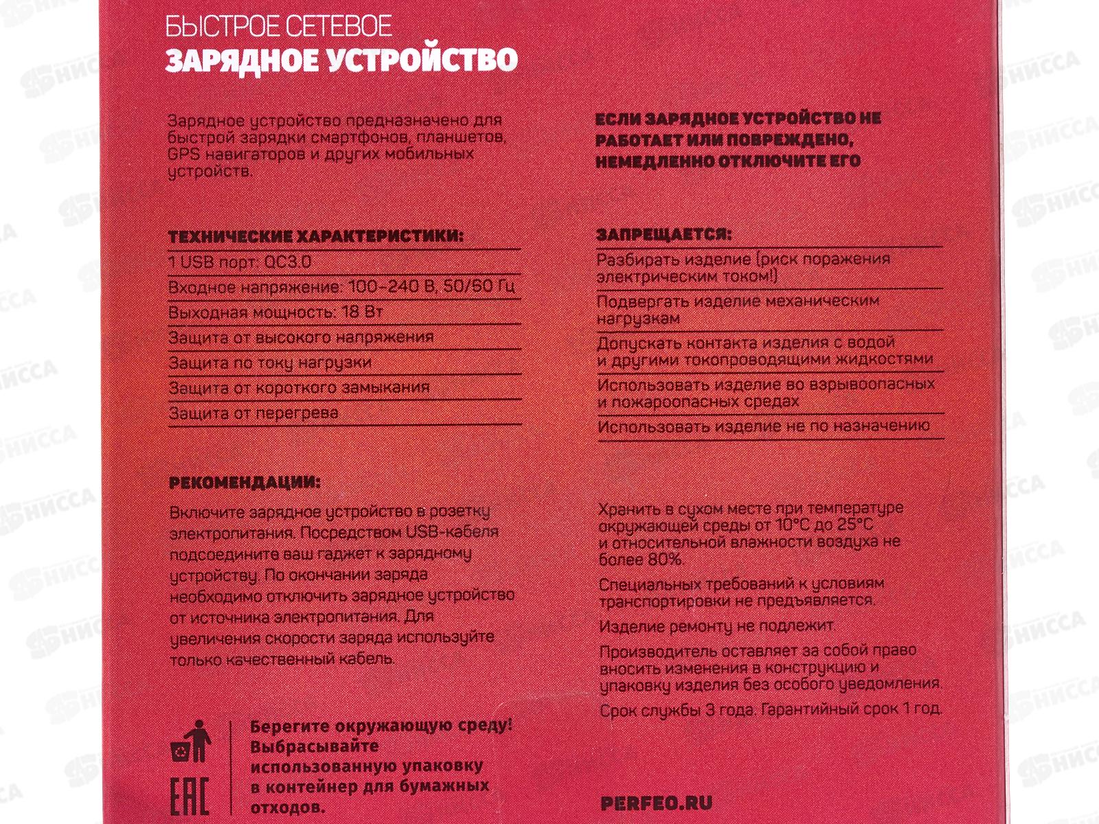 PERFEO I4667 — компактное и производительное сетевое зарядное устройство, оснащённое технологией Quick Charge 3.0. Разработанное для быстрой зарядки совместимых мобильных устройств, оно способно обеспечить полный цикл зарядки гораздо быстрее обычных аналогов. Идеально подходит для смартфонов, планшетов и других устройств с поддержкой QC3.0.
