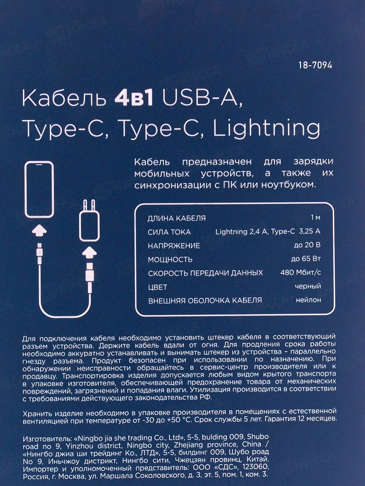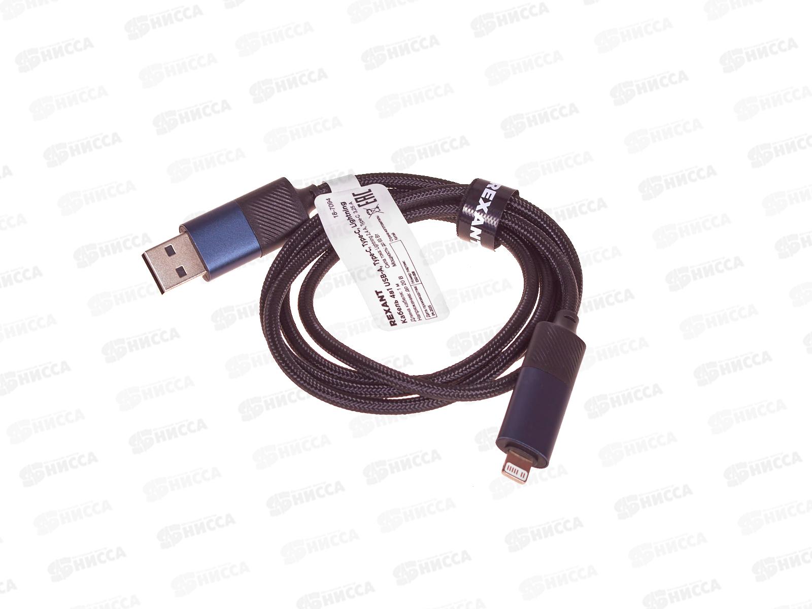 Кабель 4в1 USB-A, Type-C, Type-C, Lightning 65Вт, 1м, в черной нейлоновой оплетке REXANT, 18-7094