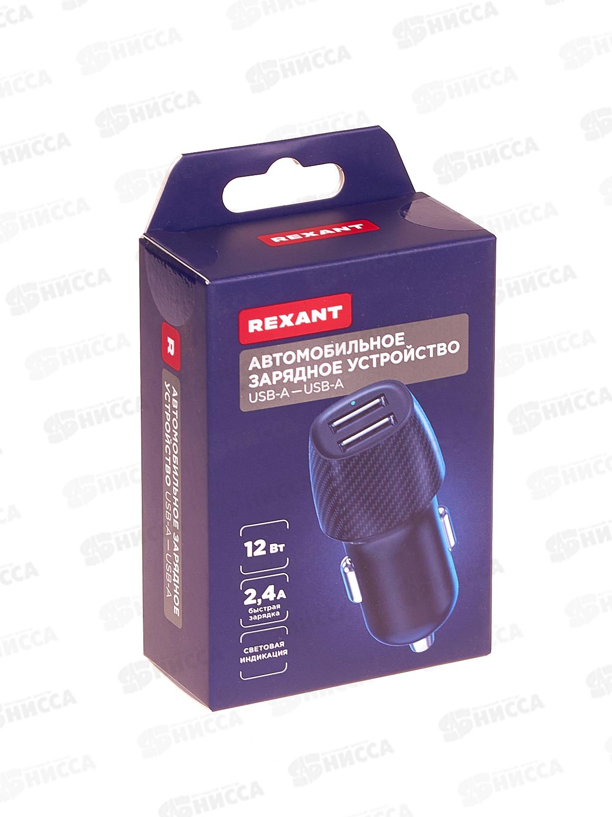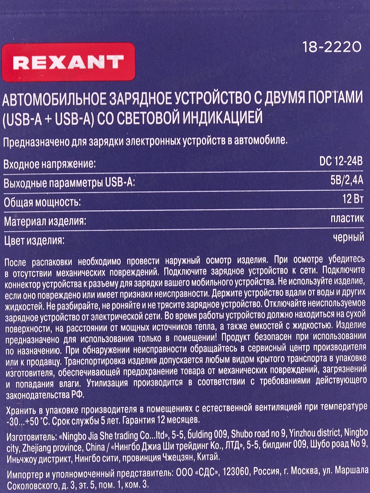 Зарядное устройство автомобильное c двумя портами (USB-А + USB-A) со световой индикацией, 12Вт, черное REXANT, 18-2220