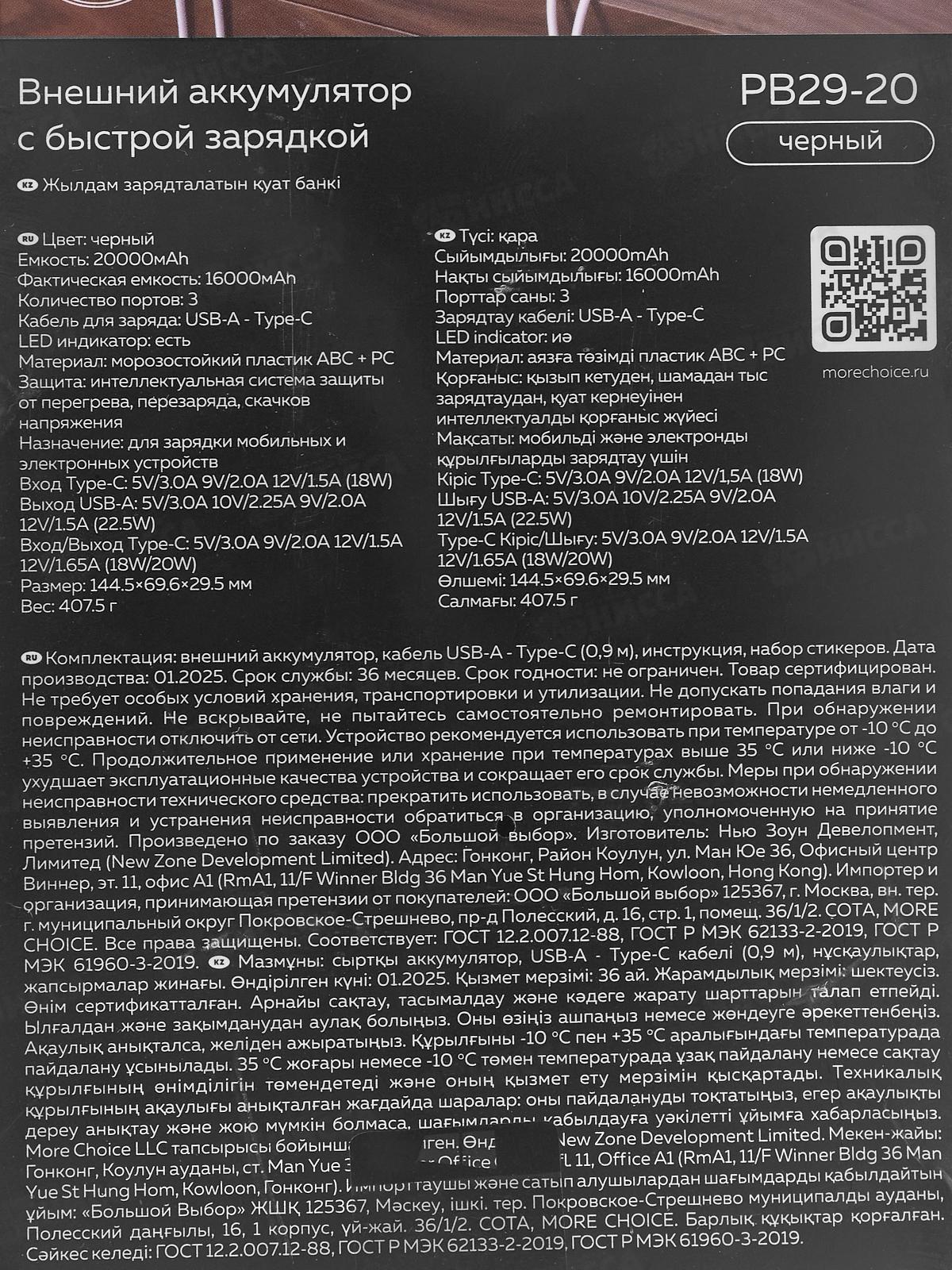 Зарядное устройство (Пауэрбанк) 1USB 3.0A 20000mAh б/з PB29-20 Black