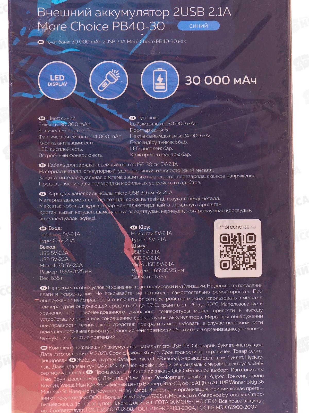 Зарядное устройство (Пауэрбанк) 2USB 2.1A 30000mA PB40-30 Blue