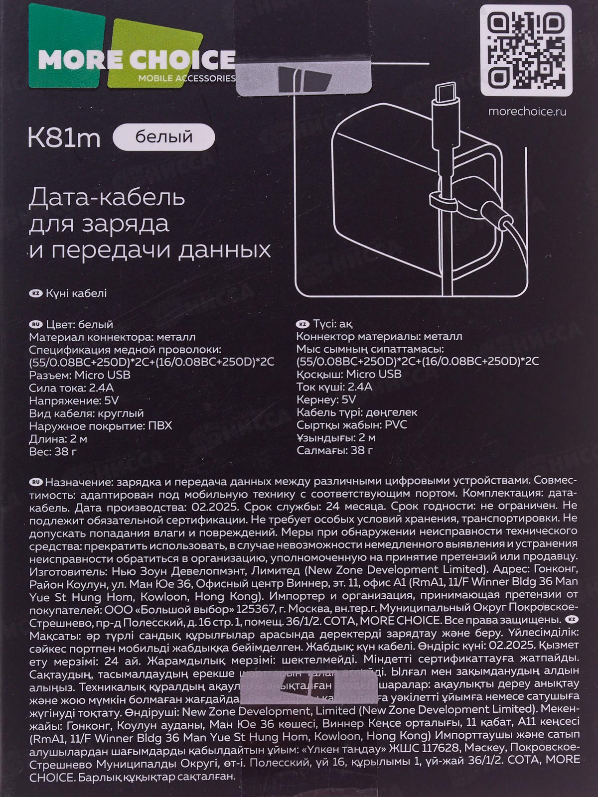 Дата-кабель USB 2.4A для micro USB More choice K81m ПВХ 2м белый