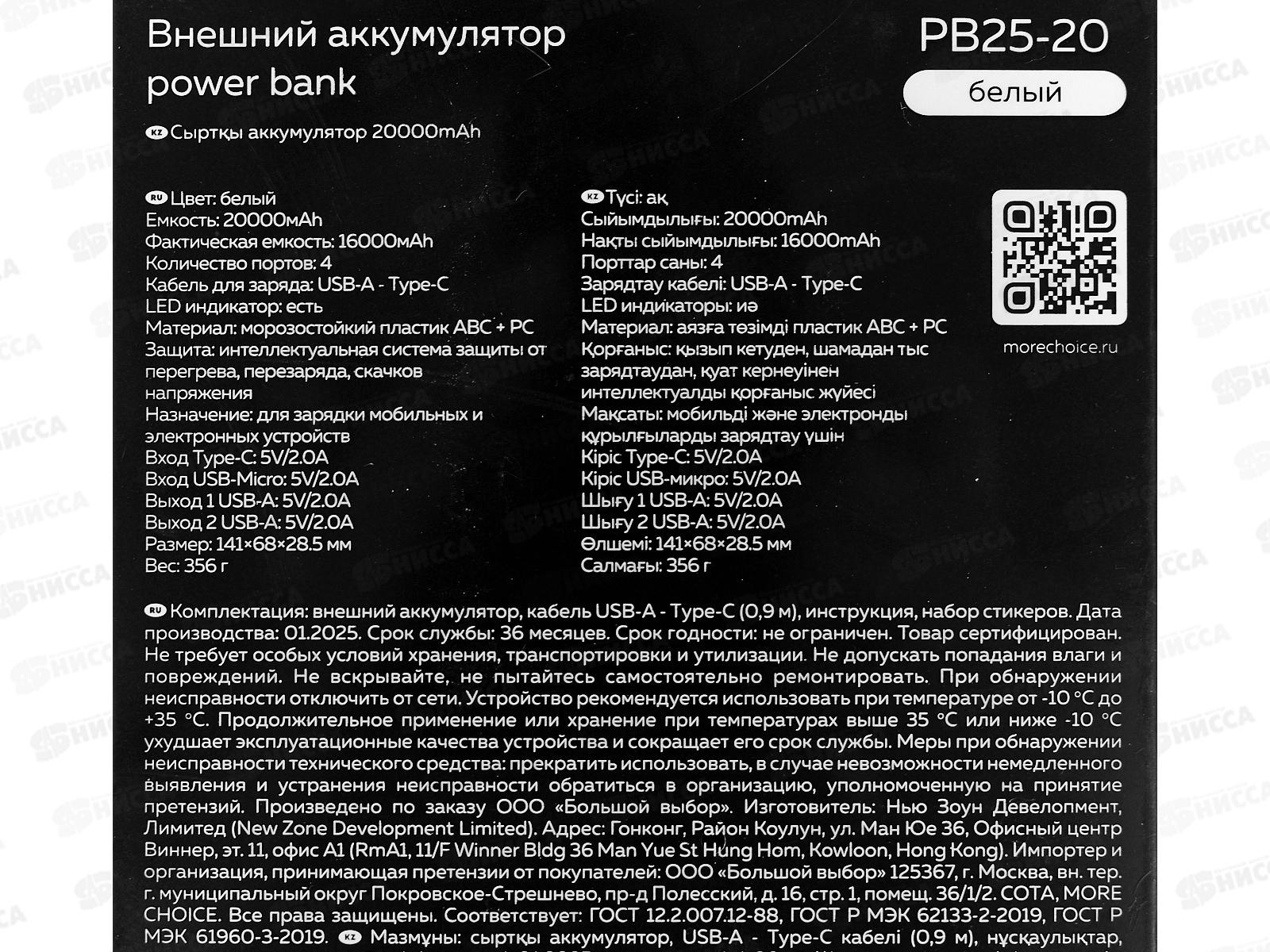 Зарядное устройство (Пауэрбанк) 2USBmicro USB 20000mAh PB25-20 White