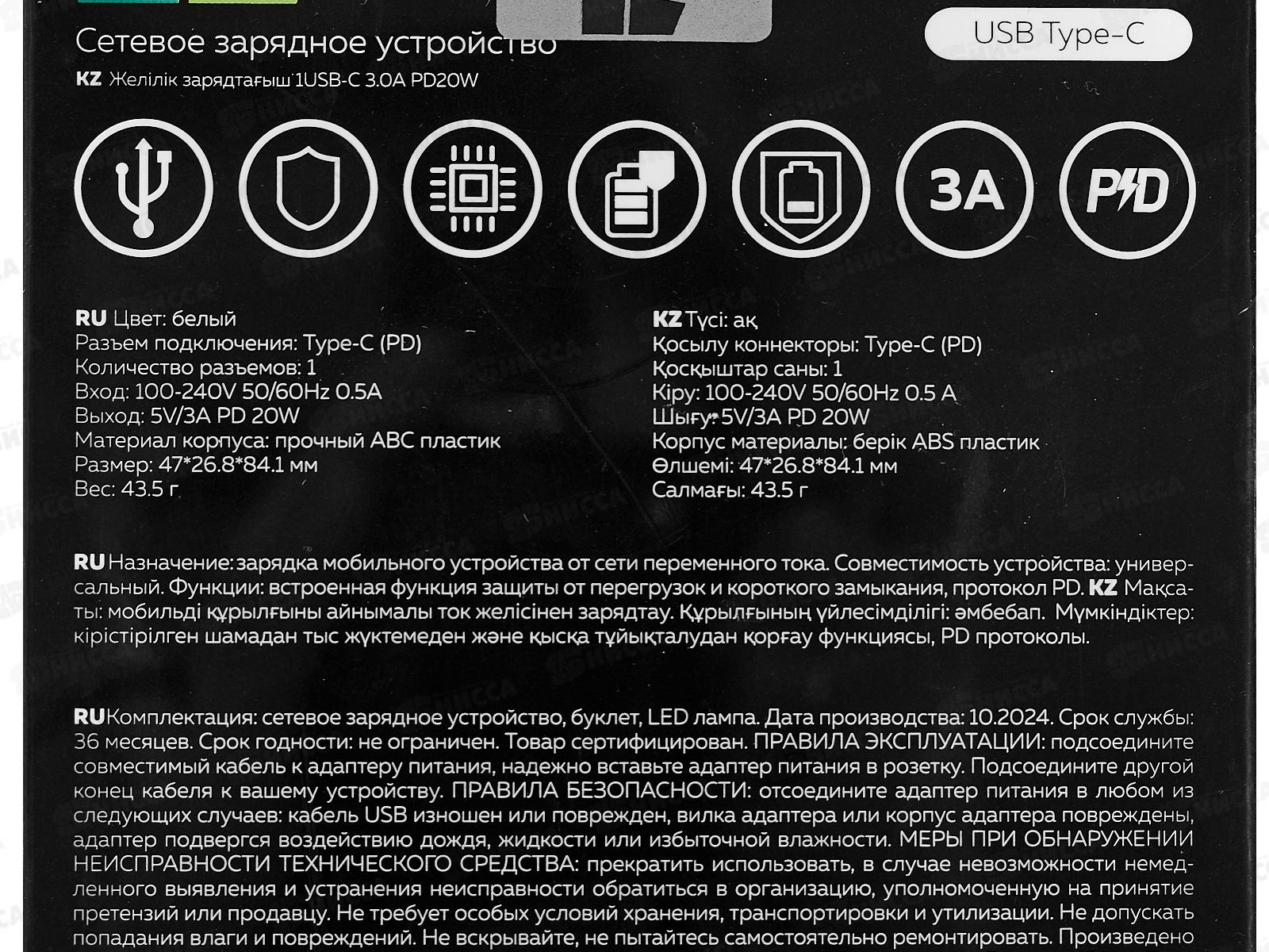 З/у сетевое 1Туре-С 3.0A PD20W More choice NC60 белый