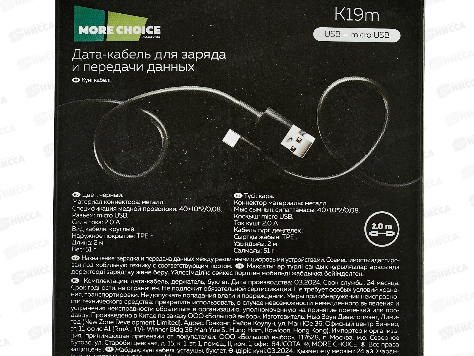 Дата-кабель More USB 2.0A для micro USB More choice K19m TPE 2м Black
