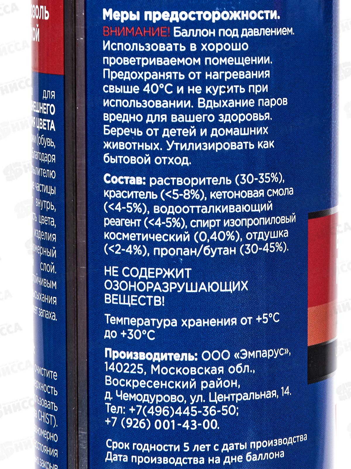 Состав: растворитель (30-35%), краситель (<5-8%), кетоновая смола (<4-5%), водоотталкивающий реагент (<4-5%), спирт изопропиловый косметический (0,40%), отдушка, пропан/бутан (30-45%).