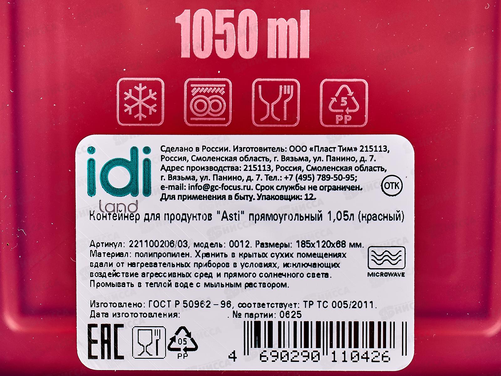 Контейнер для продуктов "Asti" прямоугольный 1,05л красный 221100206/03 *24
