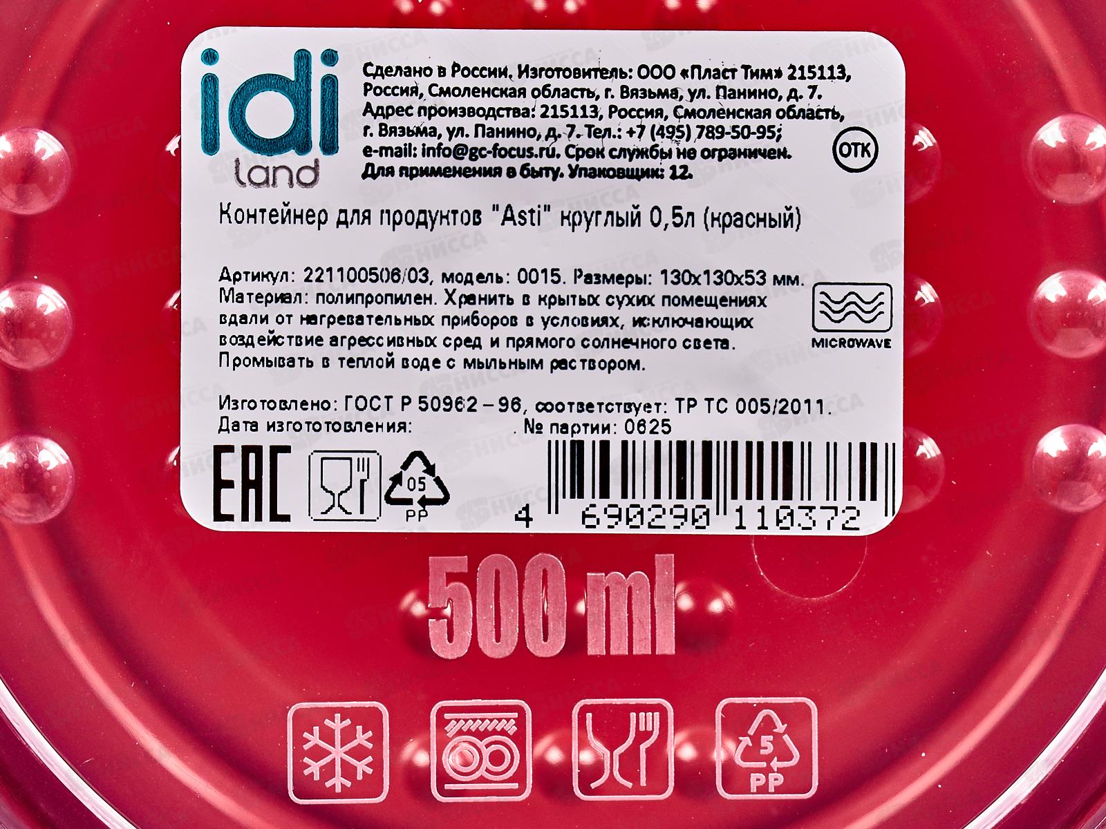 Контейнер для продуктов "Asti" круглый 0,5л красный 221100506/03*26