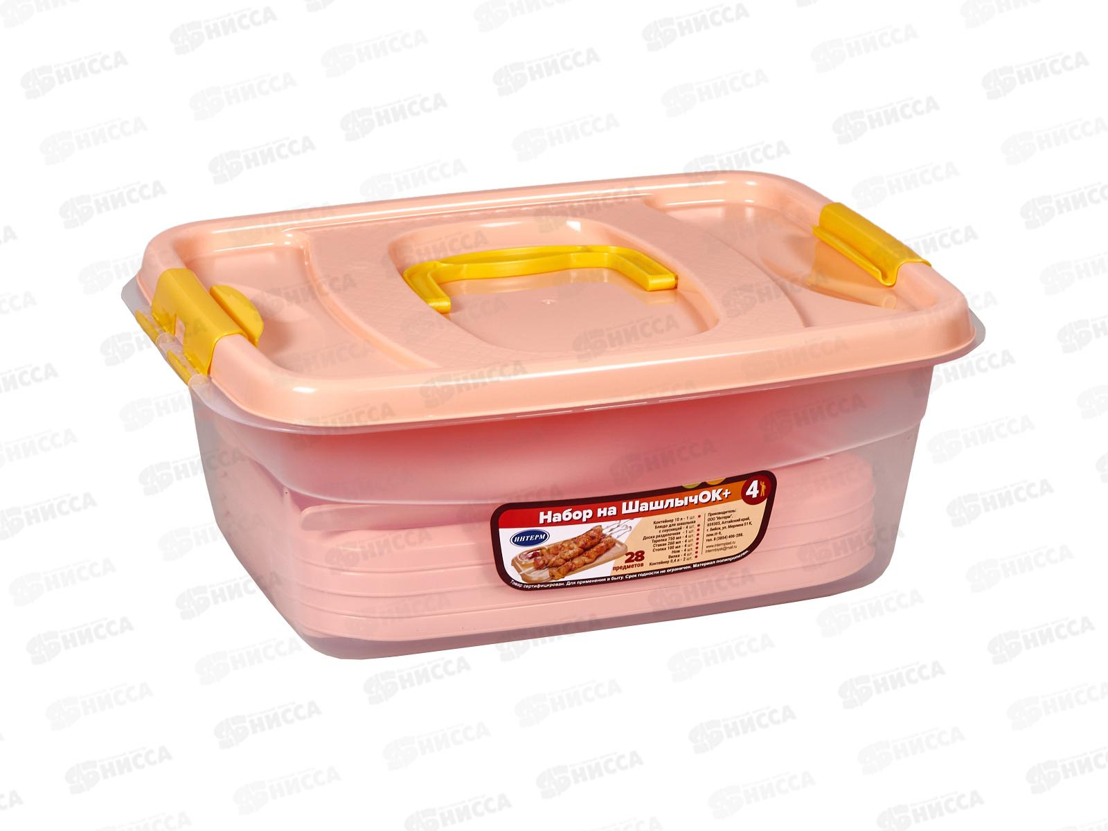 Состав набора: контейнер 10 л - 1 шт, блюдо для шашлыка с соусницей - 4 шт, доска разделочная 250х160х4 - 1 шт, контейнер 400 мл - 2 шт, тарелка столовая 220х40 750 мл - 4 шт, стакан 260 мл - 4 шт, стопка 100 мл - 4 шт, вилка - 4 шт, нож - 4 шт.