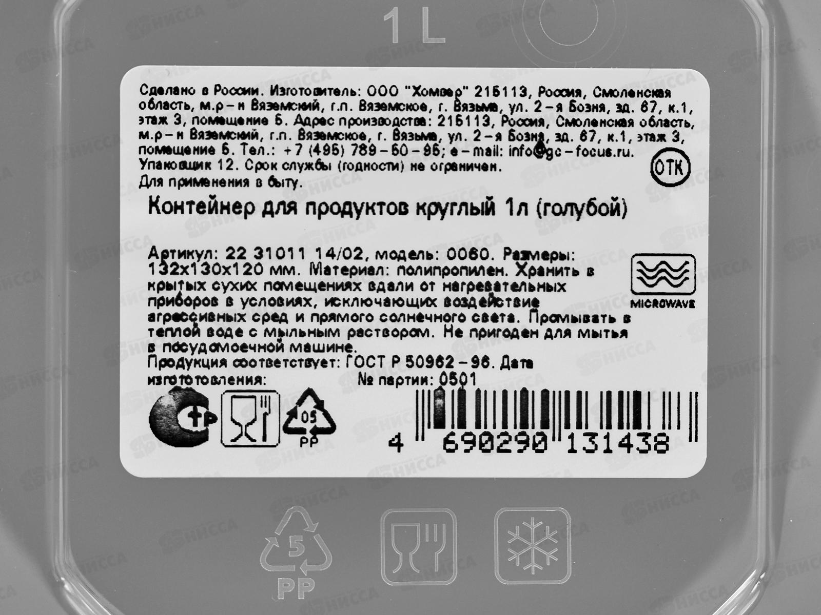 Контейнер для продуктов 1л круглый голубой 223101114/02 *18