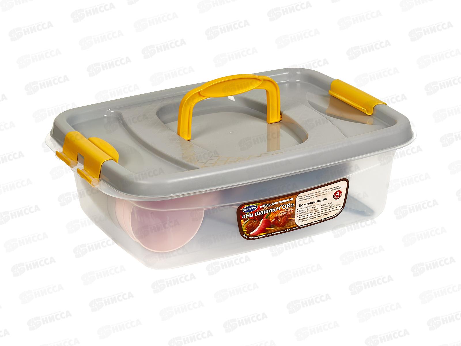 Состав набора: контейнер 8 л - 1 шт; тарелка большая 1 л - 2 шт; тарелка средняя 0,48 л - 4 шт; стопка 100 мл - 4 шт; кружка 400 мл - 4 шт; вилка - 4 шт; нож - 4 шт.