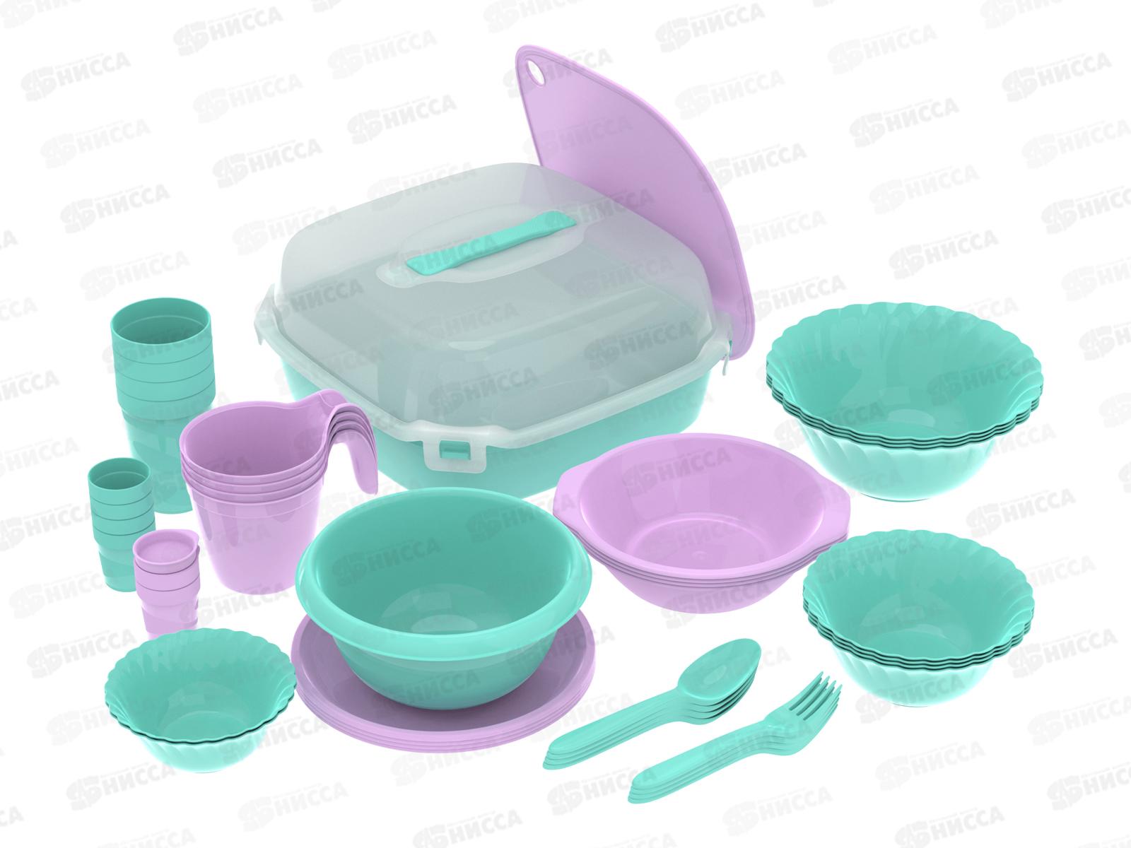 Состав набора: контейнер 9 л, доска разделочная квадратная, 4 тарелки суповые 0,7 л, 4 тарелки десертные D-19,5 см, 1 миска 1,3 л, 2 салатника 0,26 л, 4 салатника 0,5 л, 4 салатника 1,2 л, 4 стакана 250 мл, 4 кружки 400 мл, 4 стопки 100 мл, 2 солонки 100 мл, 4 вилки, 4 ложки, 4 ножа