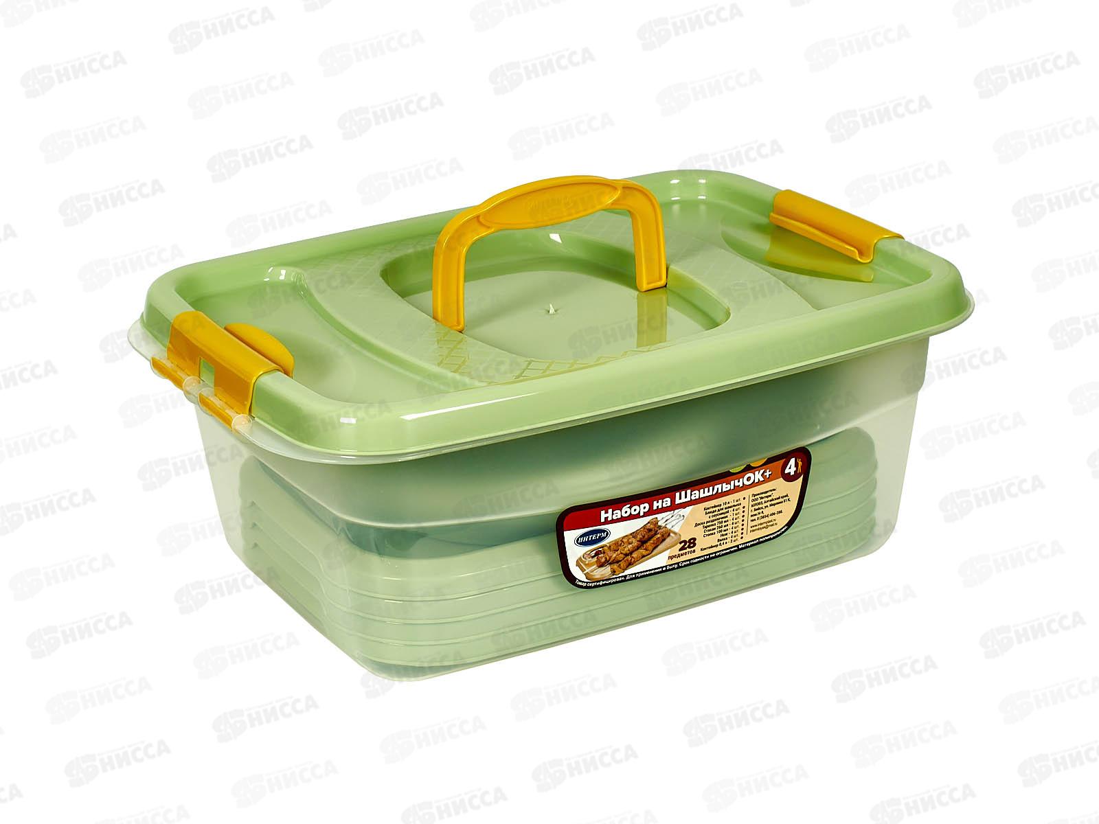 Состав набора: контейнер 10 л - 1 шт, блюдо для шашлыка с соусницей - 4 шт, доска разделочная 250х160х4 - 1 шт, контейнер 400 мл - 2 шт, тарелка столовая 220х40 750 мл - 4 шт, стакан 260 мл - 4 шт, стопка 100 мл - 4 шт, вилка - 4 шт, нож - 4 шт.