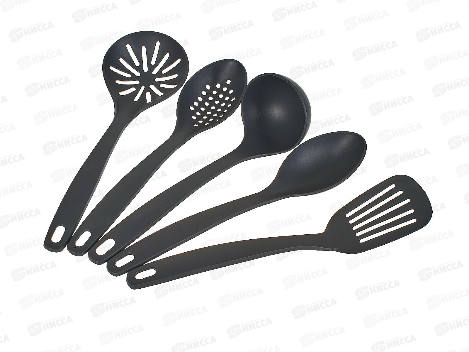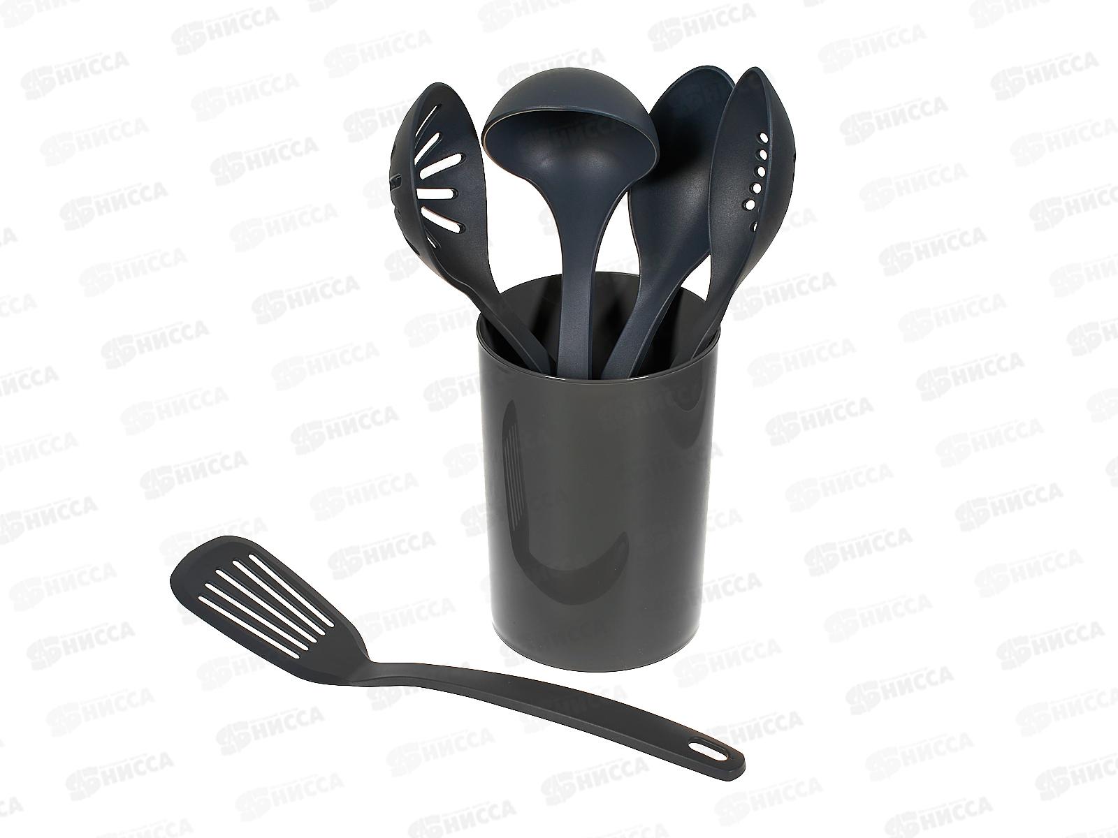 В комплект входит: половник, лопатка, шумовка, ложка поварская, ложка поварская с отверстиями, подставка.