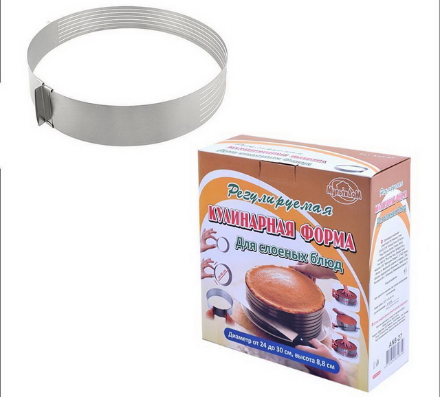 Кулинарная форма для нарезки коржей поможет аккуратно справиться со сложной задачей — нарезкой бисквита на одинаковые коржи. Тонкий бисквит идеально подходит для приготовления тортов, пирожных. Запеките тесто в обычной форме любой высоты, а затем разрежьте его! Поместите в форму с отверстиями готовый бисквит, при необходимости отрегулируйте диаметр. Аккуратно нарежьте заготовку через прорези с помощью острого длинного ножа, в результате у вас получится 7 коржей одинакового размера. Процесс нарезания максимально прост и займет у вас минимум времени,внутри есть отметки для удобства регулировки.