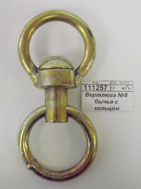 Вертлюг № 8 бычий, с кольцом — высококачественный и надёжный элемент амуниции для собаки. Он препятствует закручиванию цепи или поводка и предотвращает их запутывание. Прочная и крепкая конструкция, состоящая из двух соединённых металлических колец, улучшит условия содержания животного.