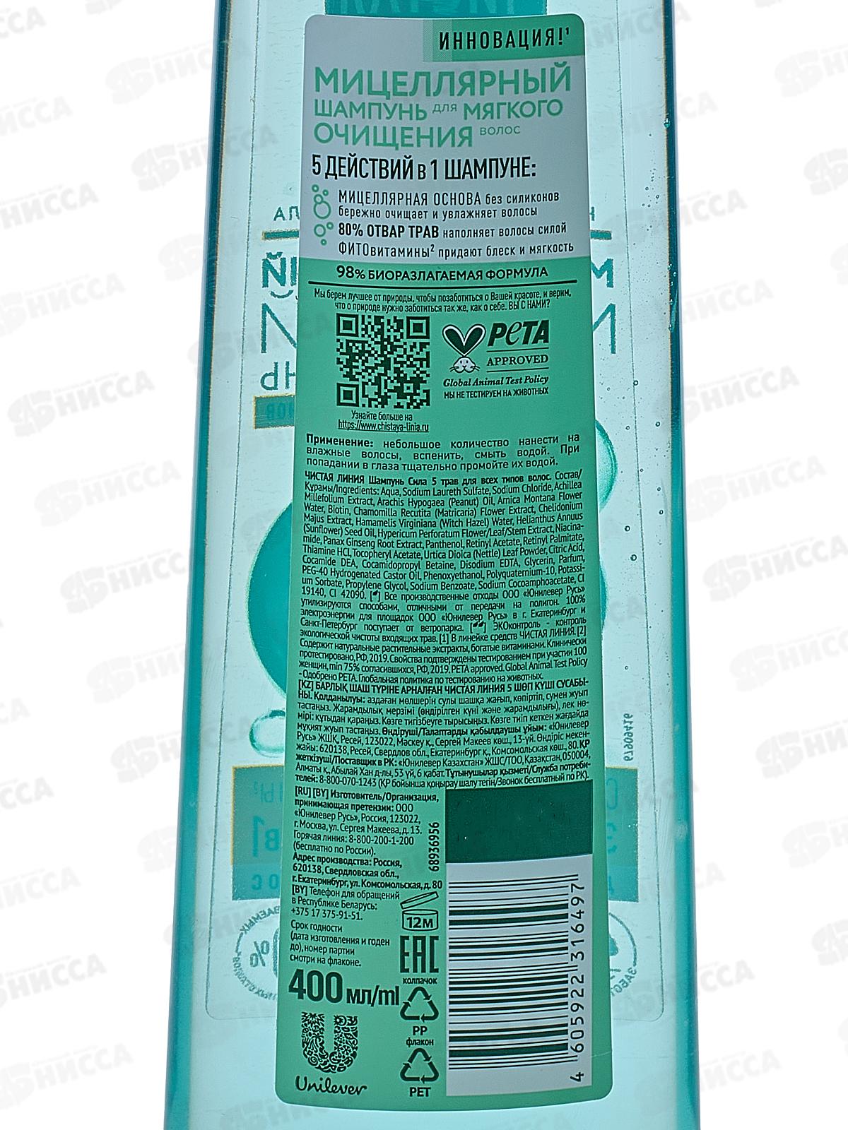 Мягкий мицеллярный шампунь Чистая линия 5в1 подходит для всех типов волос, бережно и при этом эффективно очищает, а растительные компоненты в его составе ухаживают за Вашими волосами. Мицеллярная основа бережно очищает и увлажняет волосы. 80% отвара трав наполняет волосы силой. ФИТОвитамины придают блеск и мягкость. Сразу 5 действий в 1 шампуне. БЕЗ СИЛИКОНОВ!
