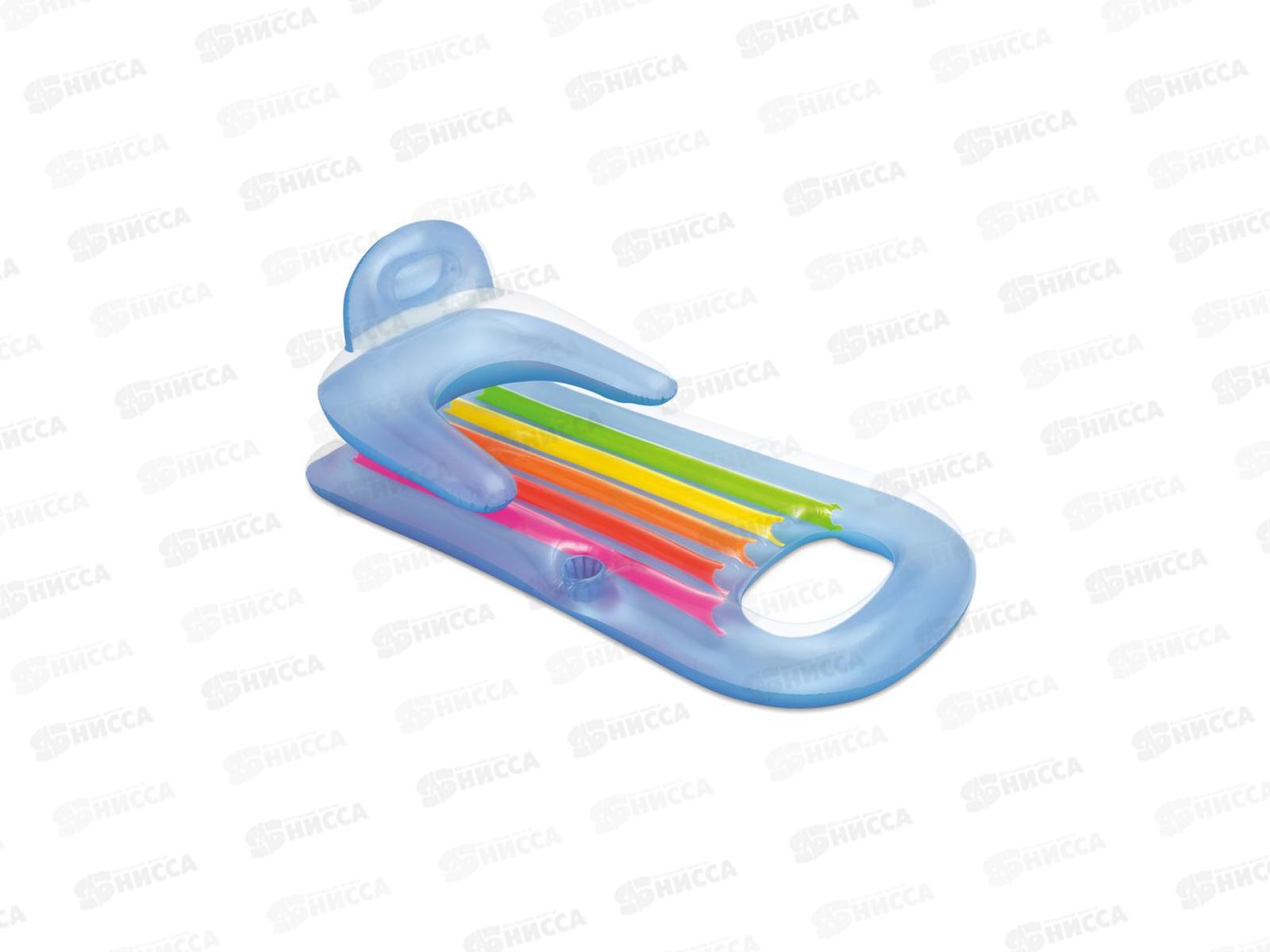 Матрас-шезлонг овальной формы для отдыха на воде. Удобные подлокотники, спинка с системой поддержки, углубление для ног, встроенный подстаканник, светоотражающее дно.