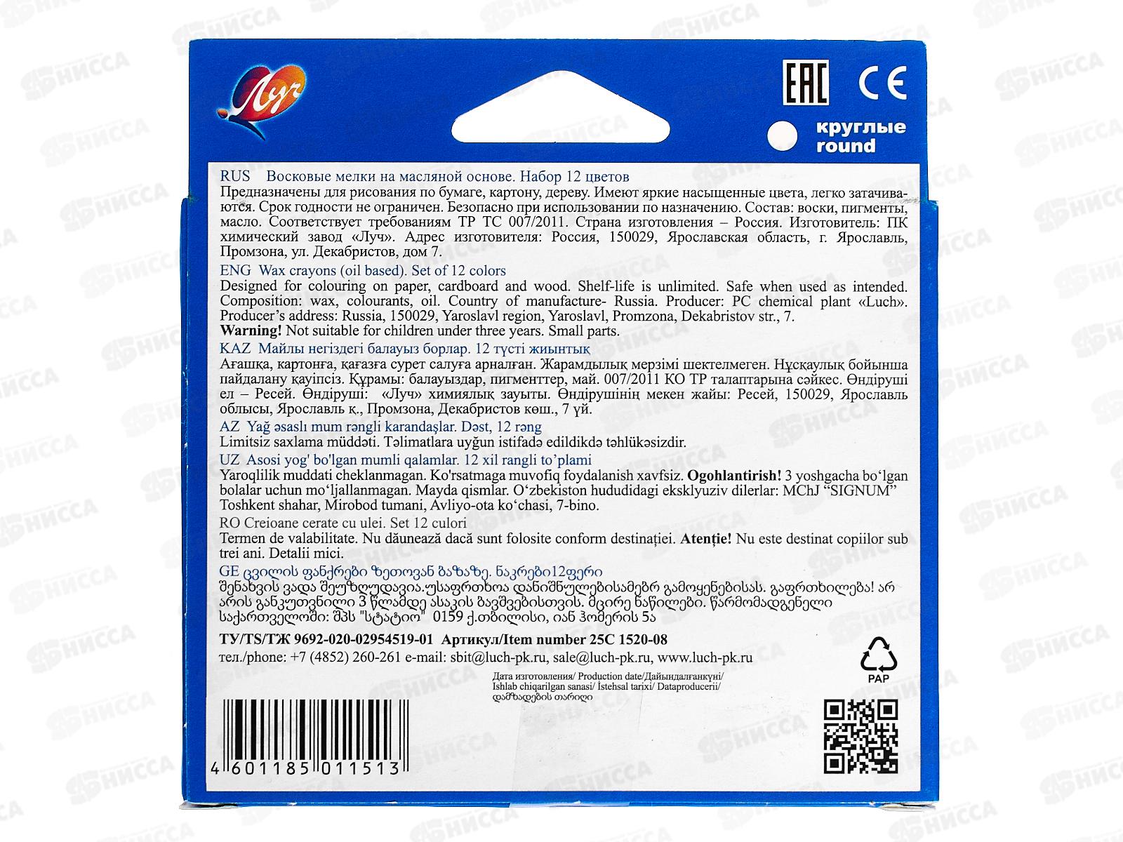 Мелки восковые ЛУЧ Фантазия 12 цветов , масляные , круглые , 25с1520-08 *32