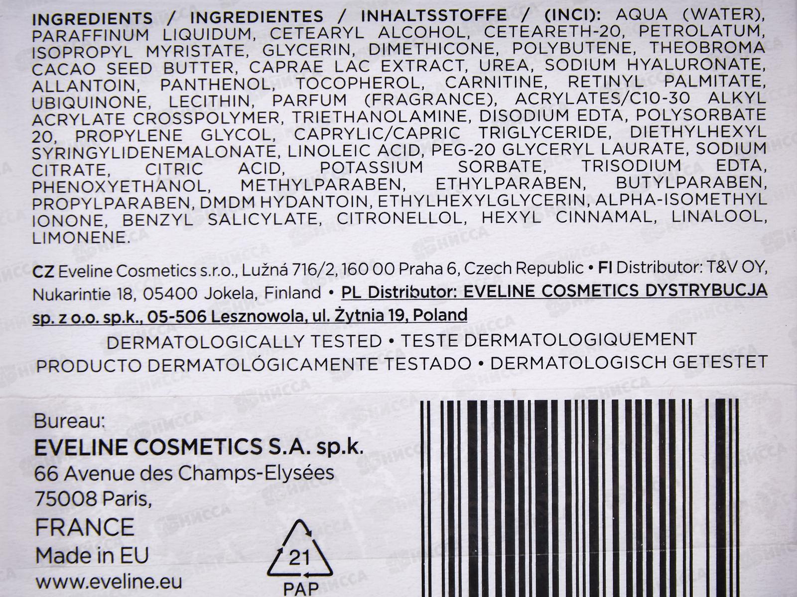 Для сухой и очень сухой кожи. 6 увлажняющих компонентов: Гиалуроновая кислота, Витамин A, Мочевина, Д-пантенол, Аллантоин, Витамин F. Состав: Aqua (Water), Paraffinum Liquidum, Cetearyl Alcohol, Ceteareth-20, Petrolatum, Isopropyl Myristate, Glycerin, Dimethicone, Polybutene, Theobroma Cacao Seed Butter, Caprae Lac Extract, Urea, Sodium Hyaluronate, Allantoin, Panthenol, Tocopherol, Carnitine, Retinyl Palmitate, Ubiquinone, Lecithin, Parfum (Fragrance), Acrylates/C10-30 Alkyl Acrylate Crosspolymer, Triethanolamine, Disodium Edta, Polysorbate 20, Propylene Glycol, Caprylic/Capric Triglyceride, Diethylhexyl Syringylidenemalonate, Linoleic Acid, Peg-20 Glyceryl Laurate, Sodium Citrate, Citric Acid, Potassium Sorbate, Trisodium Edta, Phenoxyethanol, Methylparaben, Ethylparaben, Butylparaben, Propylparaben, Dmdm Hydantoin, Alpha Isomethyl Ionone, Benzyl Salicylate, Butylphenyl Methylpropional, Citronellol, Hexyl Cinnamal, Hydroxyisohexyl 3-Cyclohexene Carboxaldehyde, Linalool.