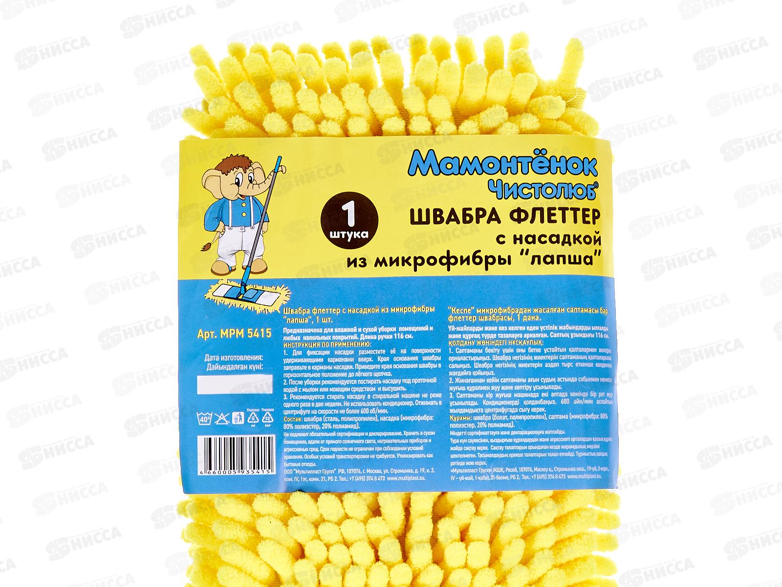 Швабра флеттер "Мамонтенок" микрофибра-лапша нетелескопическая ручка 120см *24
