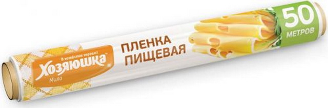Пищевая пленка "Хозяюшка Мила" 50 м, изготовленная из пищевого полиэтилена, позволяет увеличить срок хранения продуктов, предотвращает смешивание запахов в холодильнике, высыхание продуктов, обеспечивает эстетический вид продуктов, подходит для заворачивания школьных завтраков, бутербродов.