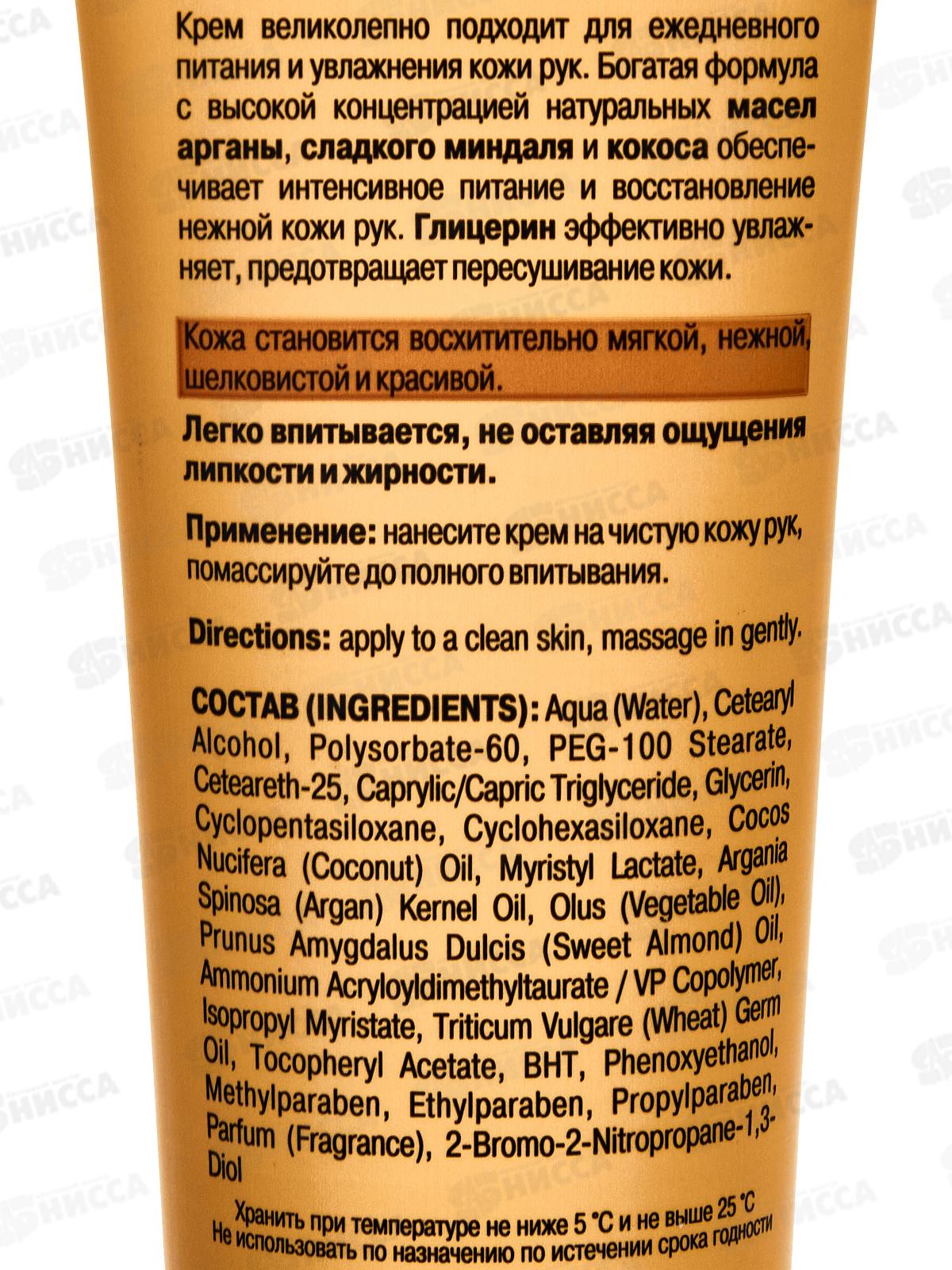 Богатая формула с высокой концентрацией натуральных масел арганы, сладкого миндаля и кокоса обеспечивает интенсивное питание и восстановление гидролипидной мантии нежной кожи рук. Состав: вода, цетеариловый спирт, полисорбат-60, ПЭГ-100 стеарат, цетеарет-25, глицерилтрикаприлат/капрат, глицерин, циклопентасилоксан, циклогексасилоксан, масло Cocos Nucifera (кокосовое), миристиллактат, масло косточек Argania Spinosa (аргана), растительное масло, масло Prunus Amygdalus Dulcis (сладкого миндаля), сополимер акрилоилдиметилтаурата аммония и винилпирролидона, изопропилмиристат, масло зародышей Triticum vulgare (пшеницы), токоферилацетат, БГТ, феноксиэтанол, метилпарабен, этилпарабен, пропилпарабен, парфюмерная композиция, 2-бром-2-нитропропан-1,3-диол.