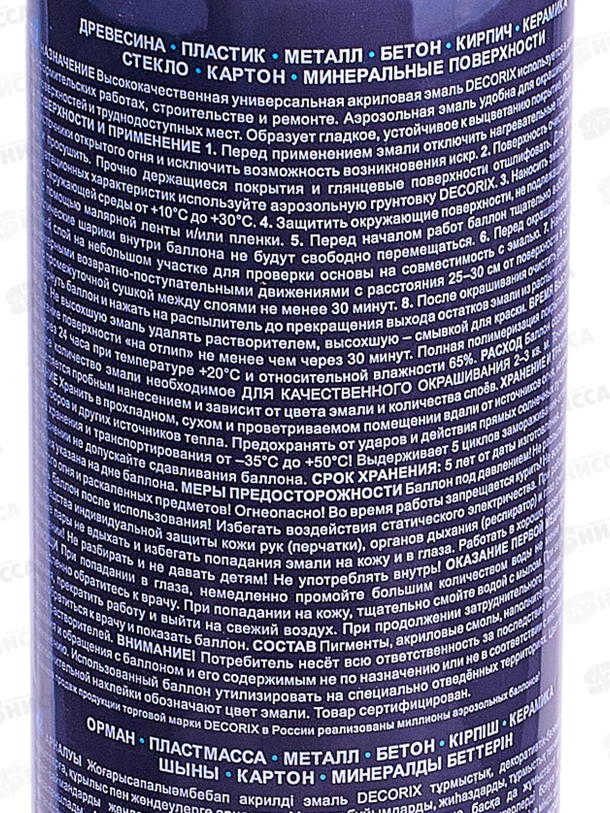 Высококачественная универсальная акриловая глянцевая эмаль DECORIX используется в декоративно-оформительских работах, строительстве и ремонте. Предназначена для окрашивания: древесины, пластика, металла, бетона, кирпича, керамики, стекла, картона, минеральных поверхностей. Аэрозольная эмаль удобна для окрашивания небольших поверхностей и труднодоступных мест. Образует гладкое, устойчивое к выцветанию покрытие.