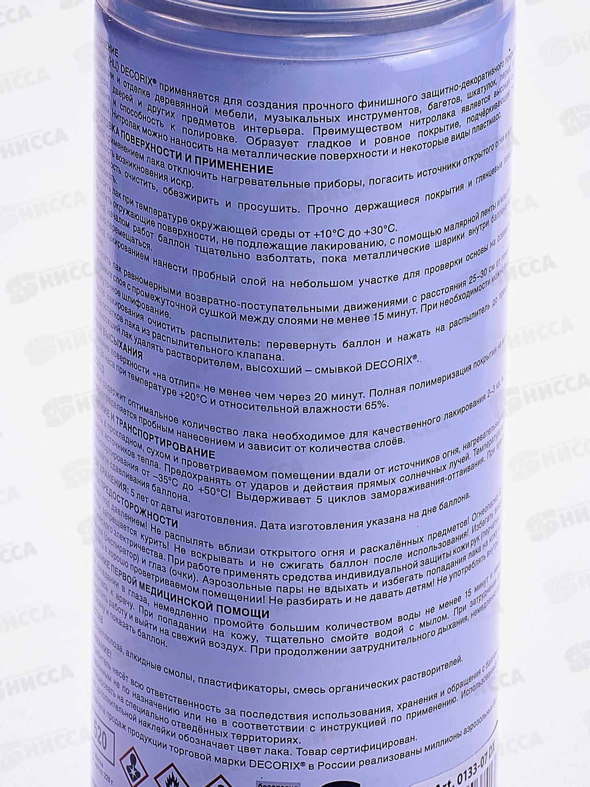 Нитролак (НЦ) DECORIX применяется для создания прочного финишного защитно-декоративного покрытия при реставрации и отделке деревянной мебели, музыкальных инструментов, багетов, шкатулок, перил, паркета, плинтусов, дверей и других предметов интерьера. Преимуществом нитролака является высокая скорость высыхания и способность к полировке. Образует гладкое и ровное покрытие, подчёркивающее текстуру древесины. Нитролак можно наносить на металлические поверхности и некоторые виды пластмасс.