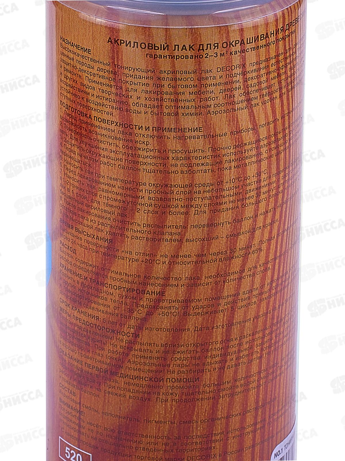 Высококачественный тонирующий акриловый лак DECORIX предназначен для декорирования поверхности под ценные породы дерева, придания желаемого цвета и подчёркивания естественной текстуры древесины. Создаёт защитно-декоративное покрытие при бытовом применении, декоративно-оформительских работах, строительстве и ремонте. Применяется для лакирования мебели, дверей, садовой мебели, багета, декорирования помещений и других видов творческих и хозяйственных работ. Лак обеспечивает устойчивость покрытия к механическим воздействиям и истиранию, обладает оптимальным соотношением твёрдости и эластичности, содержит УФ-фильтры. Образуемое покрытие устойчиво к воздействию воды и бытовой химии. Аэрозольный лак удобен для лакирования небольших и труднодоступных поверхностей.