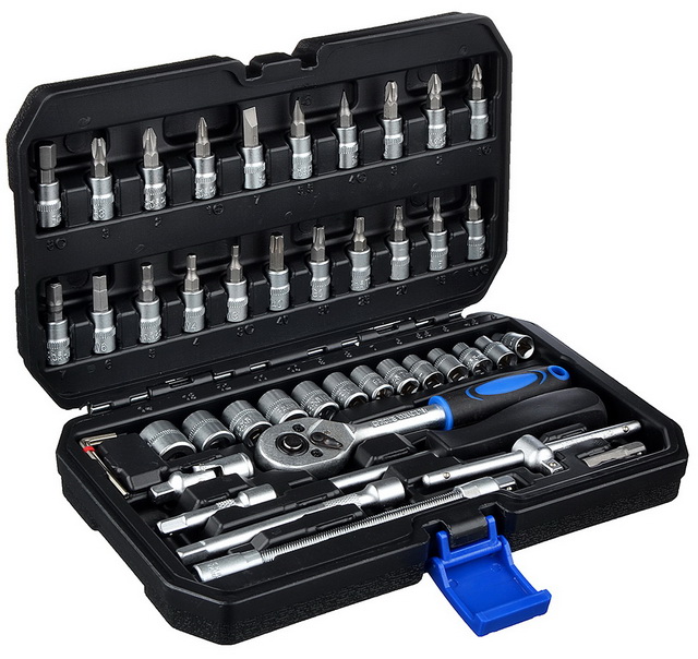 Набор автомобильных инструментов РОКОТ — надежный и практичный комплект, предназначенный для бытовых ремонтных работ и обслуживания автомобиля. Все входящие в комплект принадлежности изготовлены из высококачественной закаленной стали, поэтому надежны в применении. Эргономичные ручки обеспечивают удобный хват во время работы, а пластиковый кейс — компактное хранение 46 предметов и их комфортную транспортировку. Инструменты: отвёртки, вороток для головок, трещотка, ключи имбусовые (шестигранные), оснастка: торцевые головки, головки со вставками, аксессуары: гибкий удлинитель для головок, удлинитель для головок, шарнир карданный для головок, переходник для головок, количество имбусовых ключей: 4 шт, количество торцевых головок: 34 шт.