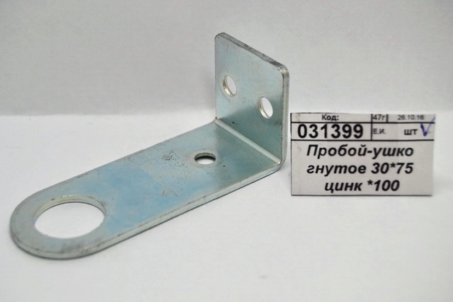 Пробой-ушко (проушина) гнутое 30х75 мм используется для запирания на навесной замок различных створок и дверей. Устанавливается парно на поверхность накладным способом таким образом, чтобы при закрывании створок/дверей отверстия под дужку замка в обеих проушинах совпали. Через отверстия, соответственно, продевается дужка навесного замка. Проушины изготавливаются из стали и покрыты слоем цинка. Оцинковка проушин позволяет использовать их на открытом воздухе. Пробой ушко гнутое — представляет собой пластину, согнутую под прямым углом. Крепятся накладным способом при помощи шурупов или саморезов.