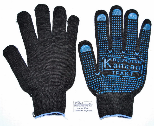 Перчатки хлопчатобумажные 4-и нитка 10класс "Эконом" черные с ПВХ "Капкан" Э размер 8*10/300