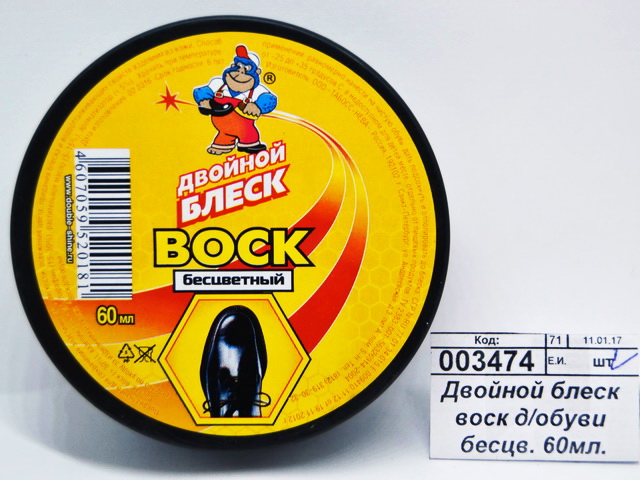 Бесцветный воск для обуви от бренда Двойной блеск. Воск надежно защищает кожу обуви от вредных воздействий воды, соли, пыли и солнечных лучей. Создает водоотталкивающий слой, придает блеск. Натуральные компоненты, входящие в состав воска, сохраняют мягкость и эластичность натуральной кожи. Объем - 60 мл.