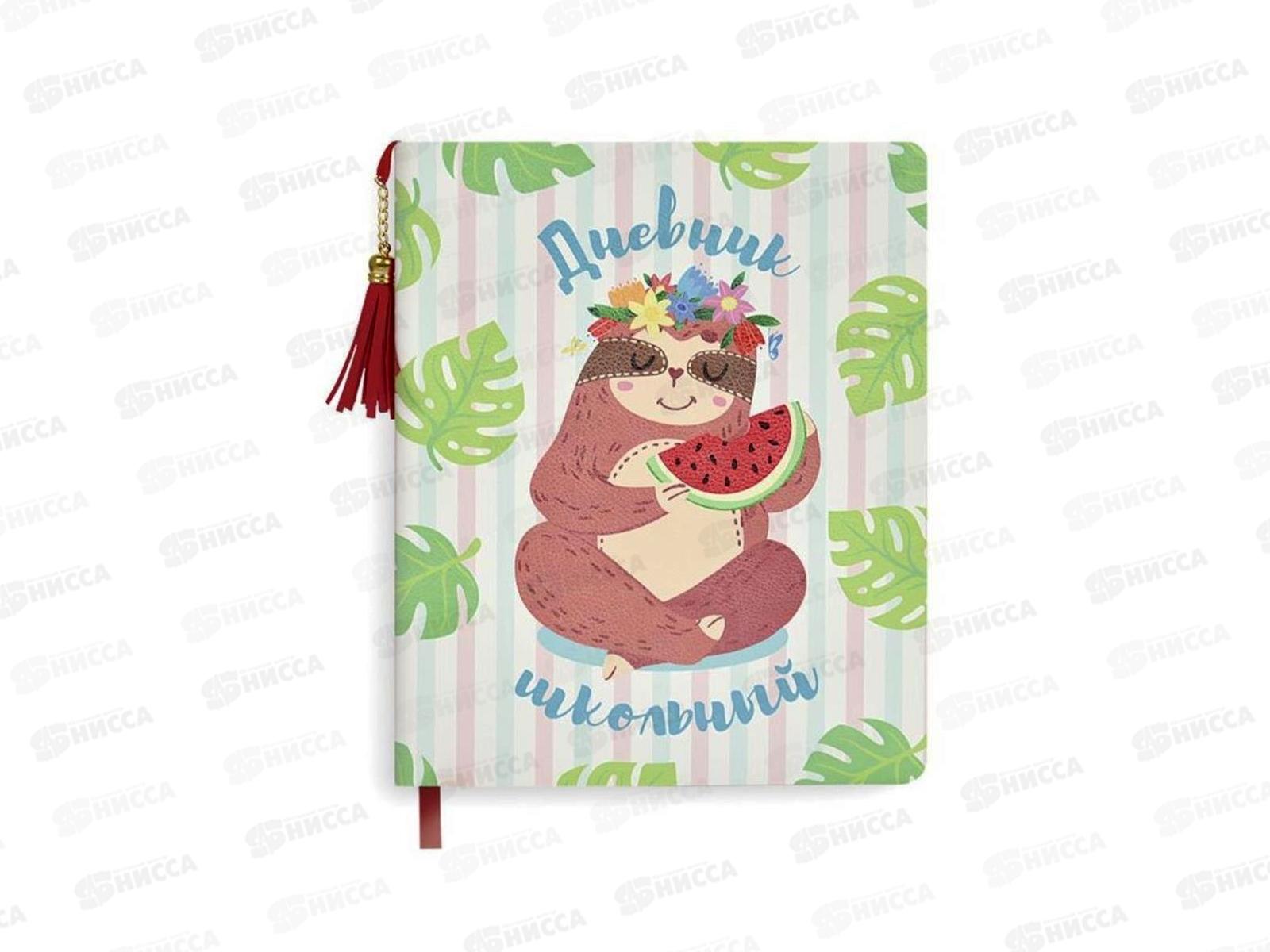 Дневник школьный ЛЕНИВЕЦ кожзам, мягкий переплёт, А5+, 48 листов, полноцветная печать, кисточка из искусственной кожи, одно ляссе, универсальная шпаргалка, ПЭТ-пакет