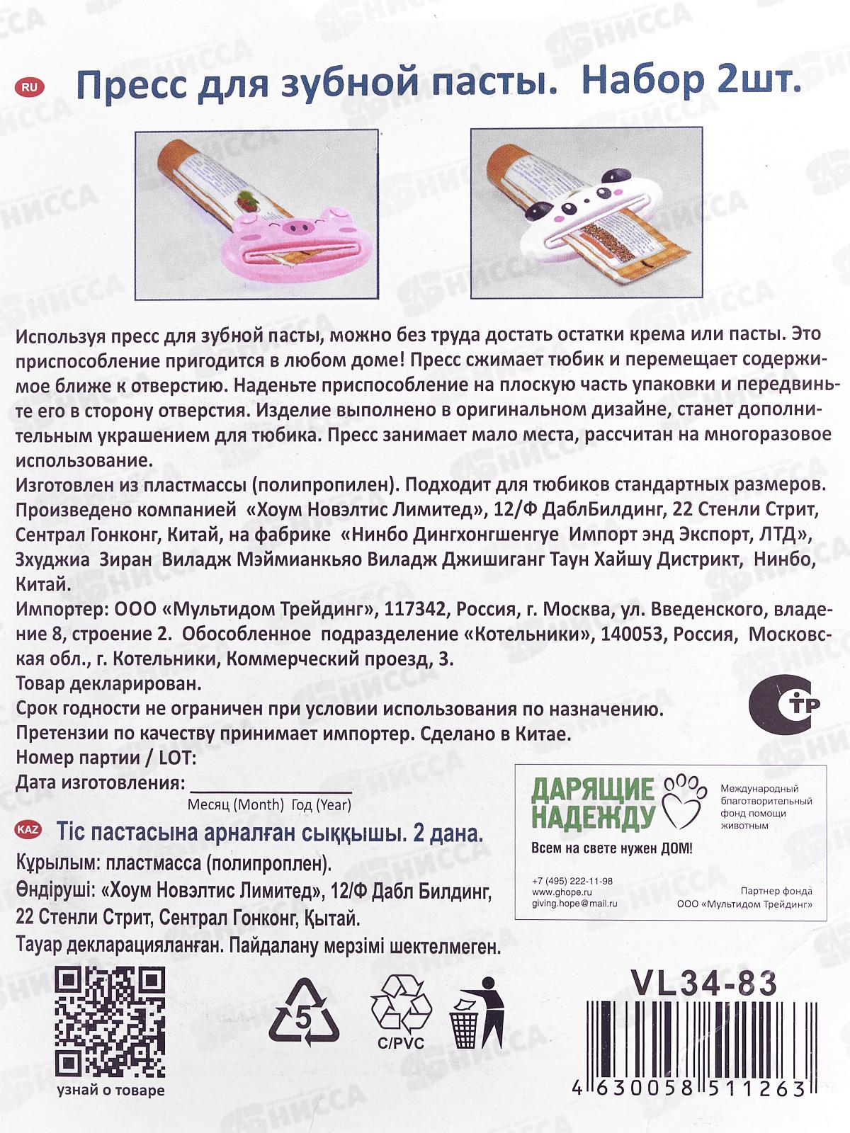 Пресс для зубной пасты "Зверята" 2шт VL34-83 *12