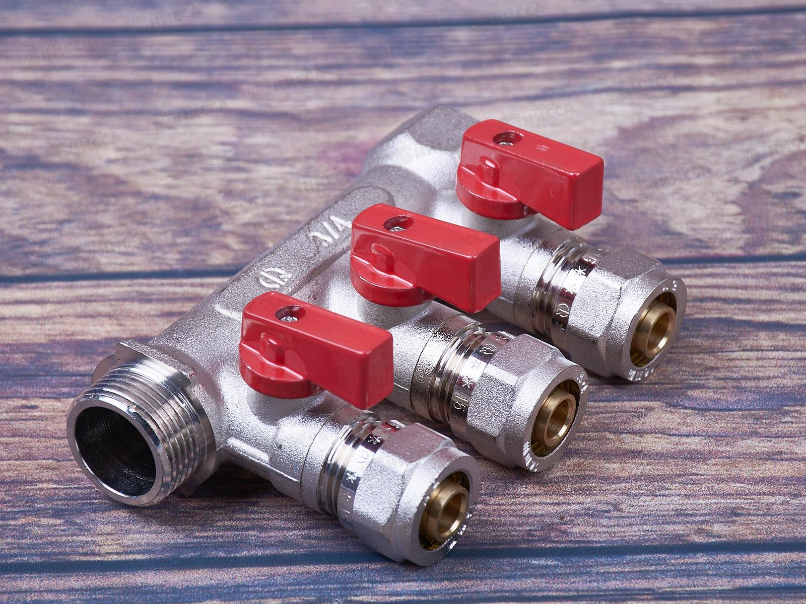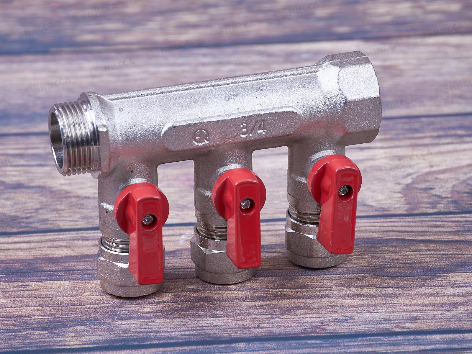 Коллектор Aqualink 03934 3 выхода с шаровыми кранами с внутренней и наружной резьбой 3/4 дюйма 16 мм используется для распределения и регулирования рабочей среды в системах горячего и холодного хозяйственно-питьевого водоснабжения, а также отопления: системы «теплый пол» и радиаторного отопления.
