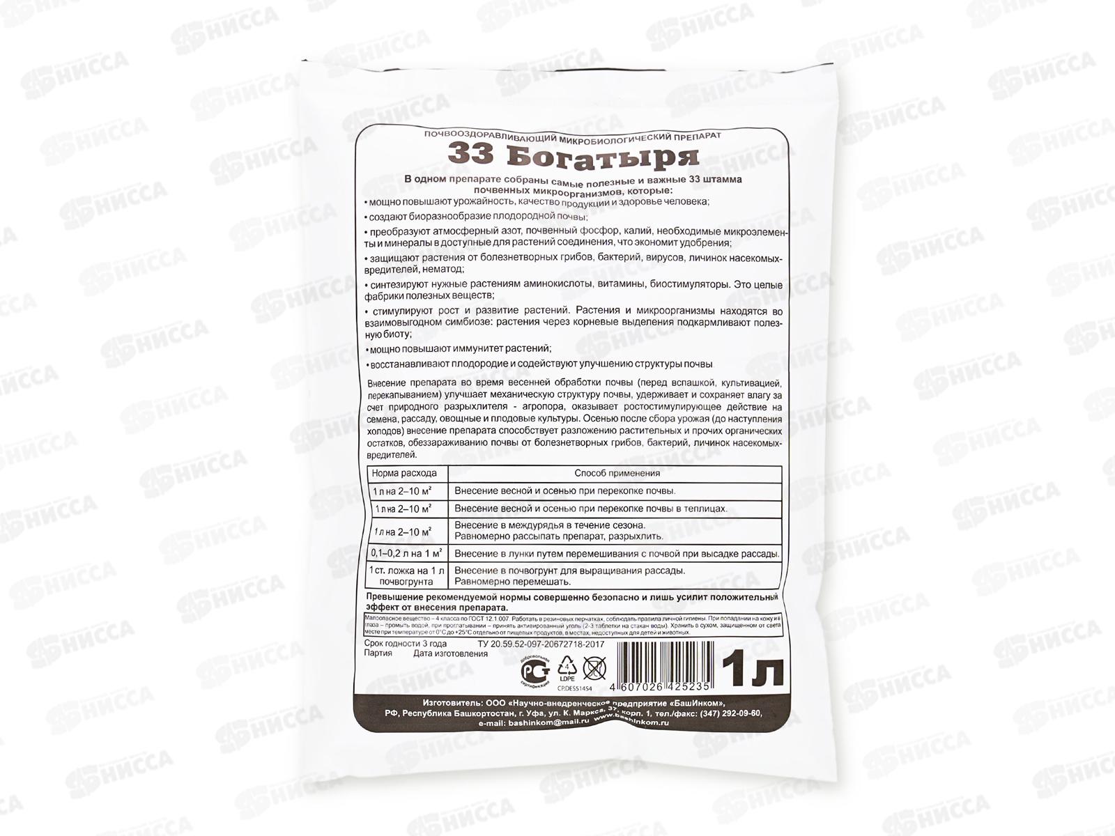 33 Богатыря – почвооздоравливающий микробиологический препарат, содержит в составе важные 33 штамма почвенных организмов. Применяется для выращивания всех видов культур и для всех видов почв. Препарат повышает урожайность и качество продукции, стимулирует рост и развитие растений, восстанавливает плодородие и содействует улучшению структуры почвы, защищает иммунитет от различных заболеваний, синтезирует нужные растениям аминокислоты, витамины, биостимуляторы.