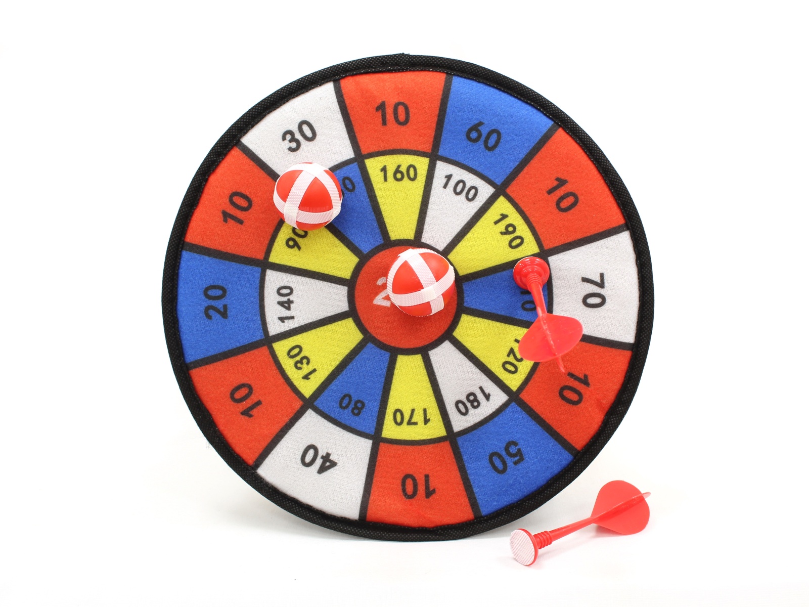 Игровой набор для взрослых и детей. Игра в дартс способствует развитию мелкой моторики, меткости и концентрации. В набор входит: мишень, 2 шарика и 2 дротика на липучке. Наличие липучки вместо классического острия обеспечивает ребенку максимальную безопасность во время игры.