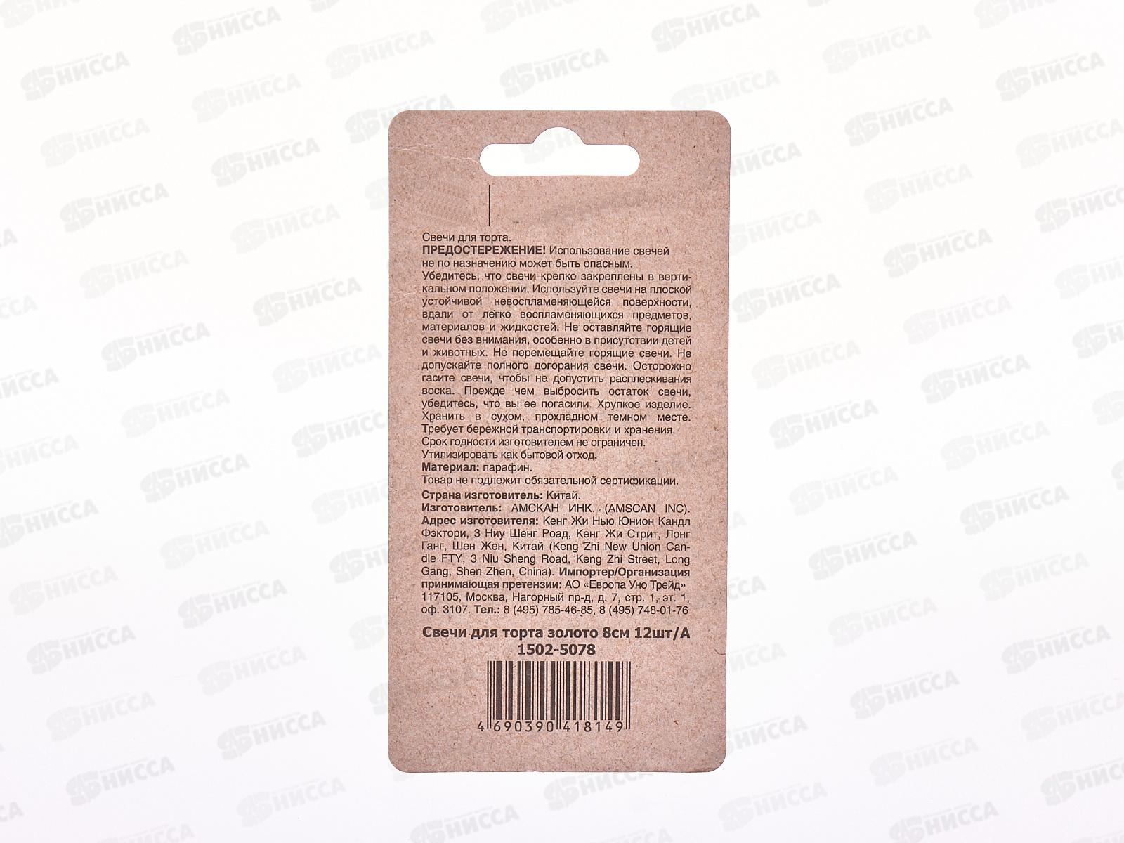 Свечи для торта золото 8см 12шт/А, 1502-5078