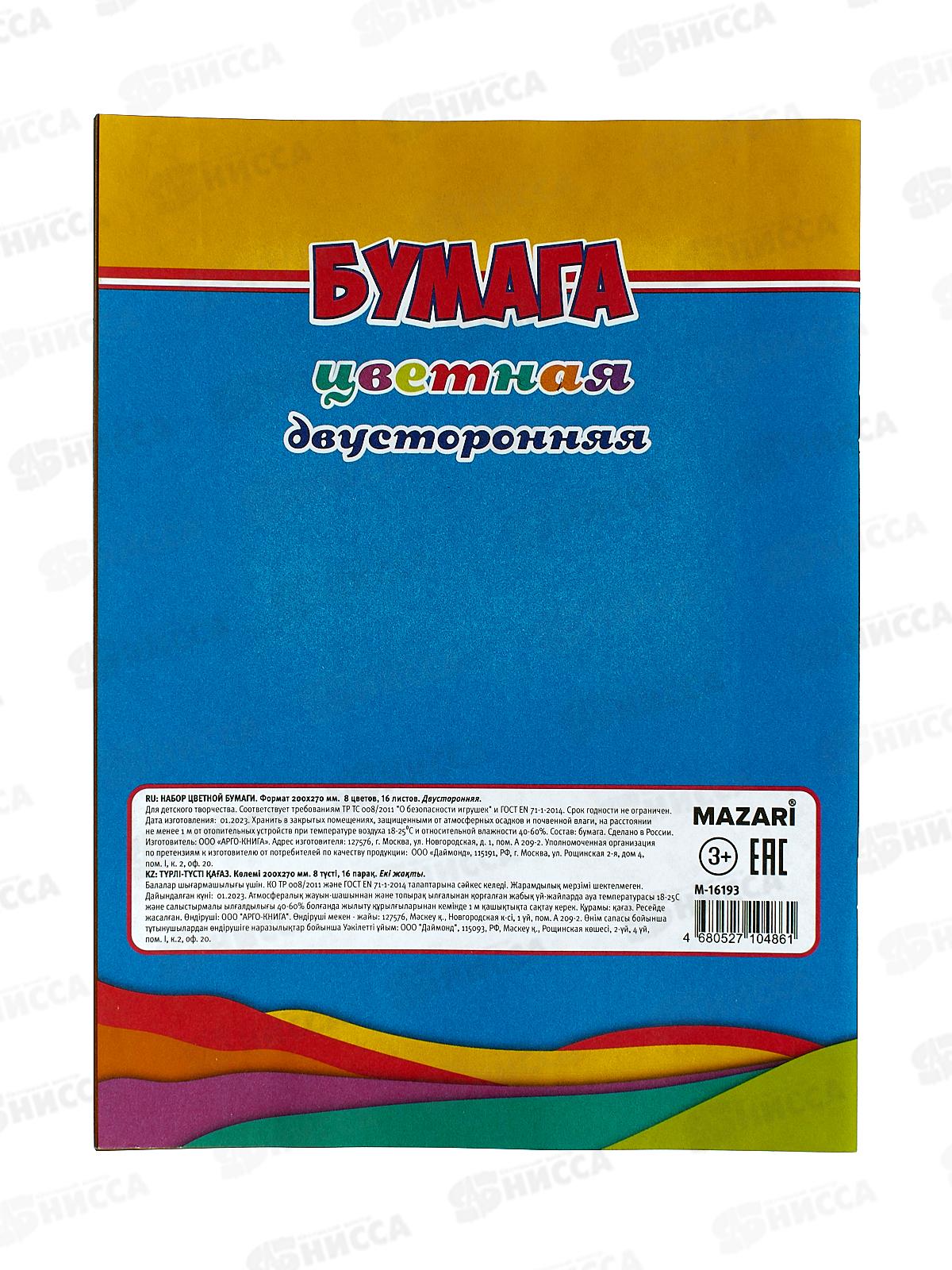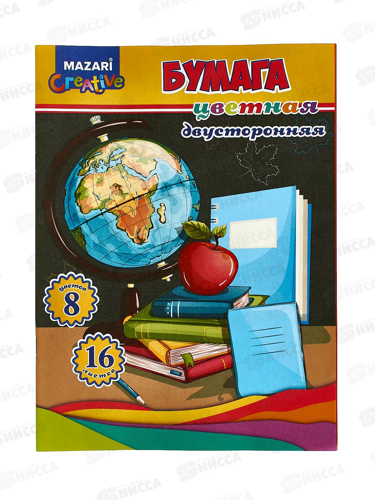 Цветная бумага 16листов 8цветов MAZARI ,офс.,двусторонняя,M-16193*50