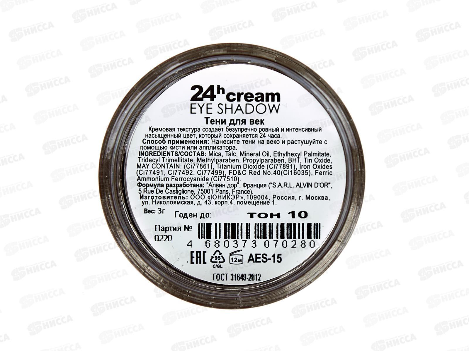 Тени для век "24h Cream EyeShadow" от бренда Alvin D'or, тон № 10. Кремовая текстура создаёт безупречно ровный и интенсивный насыщенный цвет, который сохраняется 24 часа. Легко наносятся и не забиваются в складку века создают безупречный макияж глаз, которы не тускнеет и не теряет яркость