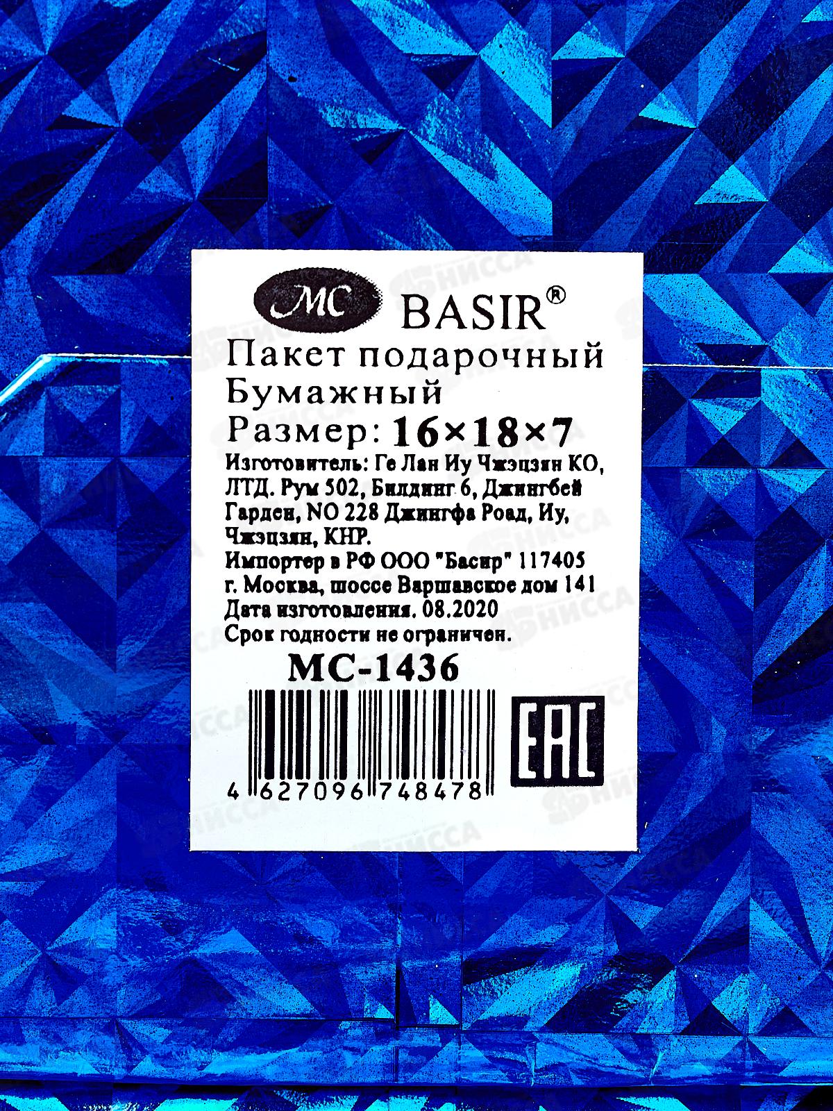 Пакет подарочный бумажный 16*18*8 см, голография, крупный рисунок, в ассортименте MC-1436 *20