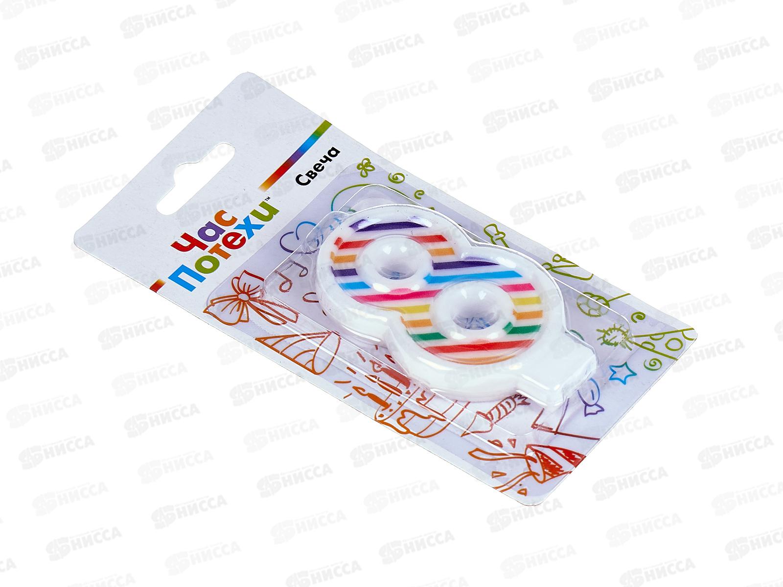 Белая свеча от торговой марки Час потехи "Полосы разноцветные", в форме цифры "8". Отличное решение для декорирования торта, десерта ко дню рождения или юбилею. Высота свечи - цифры 7 см.
