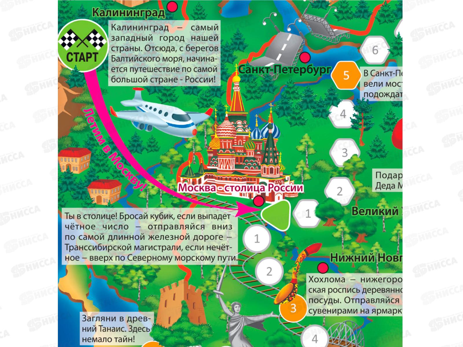Ходилка "Путешествие по России" сделана с особой любовью к просторам нашей Родины. Начинается путешествие с броска кубика, определяющего путь каждого из игроков. Всего в игре два пути – связанный с самой длинной железной дорогой России Транссибирской магистралью и связанный с Северный морским путем. Играя в "Путешествие по России", дети узнают много нового о нашей стране, ее полезных ископаемых и населяющих территорию животных. Яркие моменты на настольной игровой карте вдохновят узнать больше об интересных местах нашей Родины.