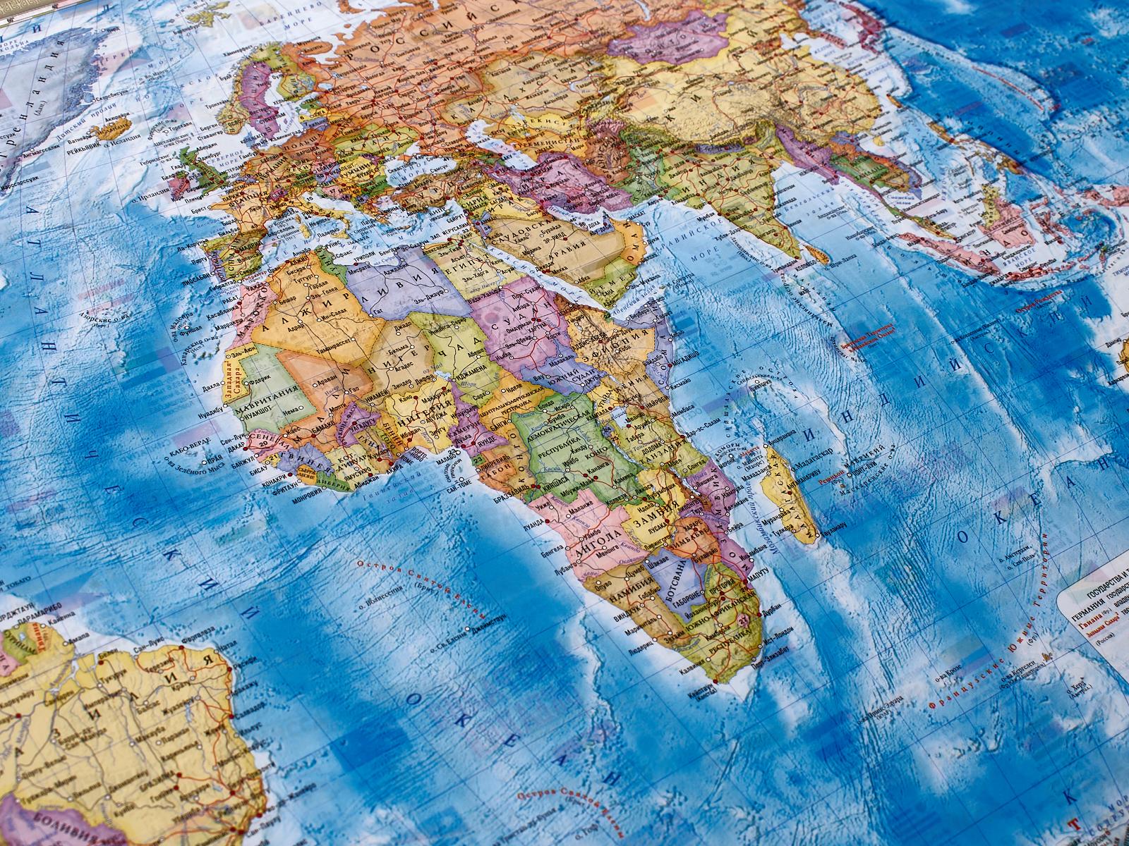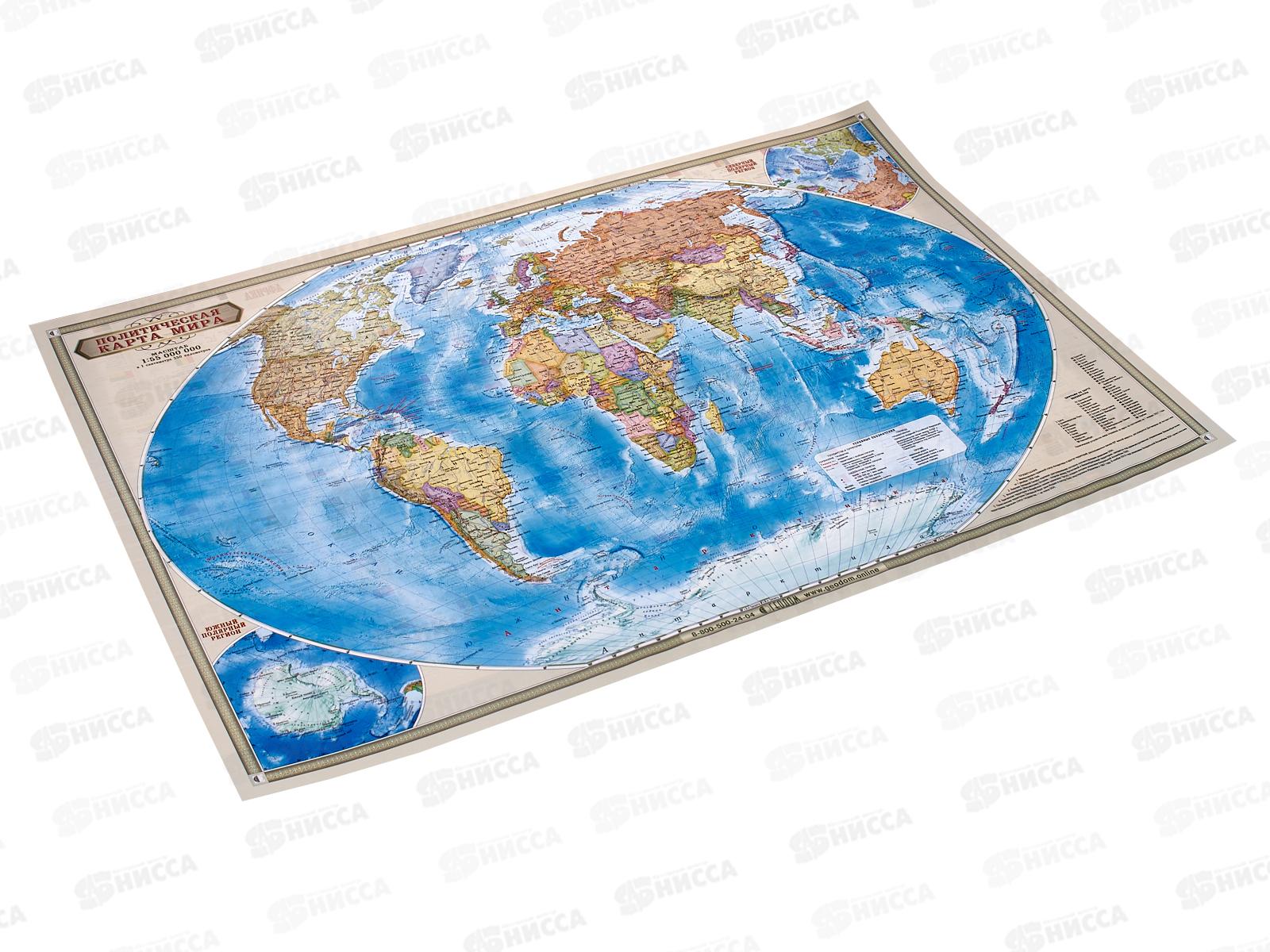 Карта политического мира подробно отражает современное политико-административное устройство мира и границы государств. Территории государств выделены цветом. Населённые пункты отображены по числу жителей и административному значению, показаны основные наземные пути сообщения и судоходные каналы. Особенность данной карты в том, что на ней, помимо геополитической информации, размещена символика государств мира. Государственные флаги стран мира сгруппированы по каждому континенту.