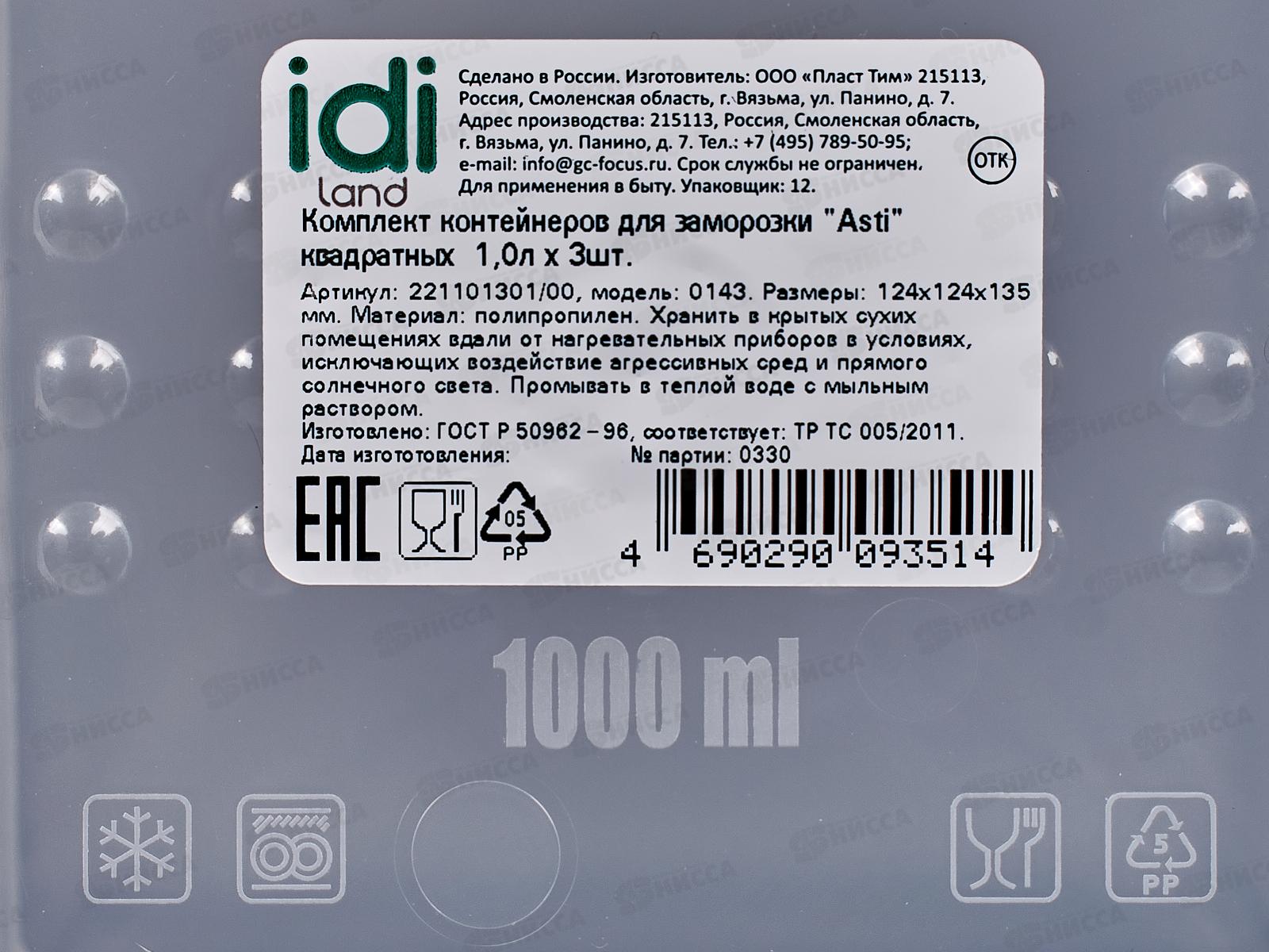 Контейнер для заморозки "Asti" квадратный 1л х 3шт 221101301/00 *12
